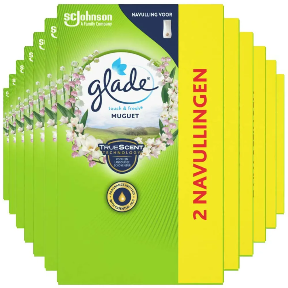 Glade Touch & Fresh Muguet duo navulling verspreidt een verfrissende geur mengeling van hyacint, zoete peer, lelietje-van-dalen en romige muskus.