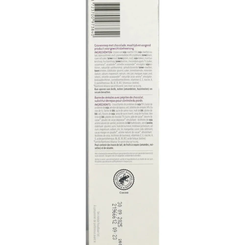 Crispies van soja-eiwitten 15% (soja-eiwitten isolaat, tapiocazetmeel, zout), granenballetjes 14% (rijstbloem, tarwebloem, ruwe rietsuiker, tarwemout, tarwegluten, zout), sojavlokken, invertsuikerstroop, fructosestroop, tarwedextrine, chocoladedruppels 7% (suiker, cacaomassa*, cacaoboter*, ontvette cacaopoeder*, emulgator: sojalecithinen, natuurlijk vanillearoma), gehydrolyseerde tarwe-eiwitten, haverzemelen, stabilisator: glycerol, suiker, zonnebloemolie, mineralen (kalium, calcium, magnesium, natrium, zink, ijzer, mangaan, koper, jood, seleen), ontvette cacaopoeder*, natuurlijk cacao-aroma*, emulgator: koolzaadlecithinen, zonnebloemlecithinen, vitaminen (C, E, niacine, A, D, pantotheenzuur, B6, B2, B1, B12, foliumzuur, biotine).