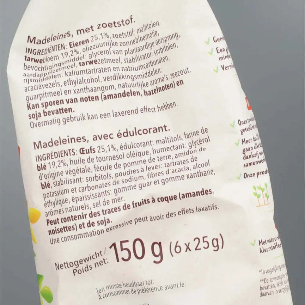 Eieren 25,1%, zoetstof: maltitolen, tarwebloem 19,2%, oliezuurrijke zonnebloemolie, bevochtigingsmiddel: glycerol van plantaardige oorsprong, aardappelzetmeel, tarwezetmeel, stabilisator: sorbitolen, rijsmiddelen: kaliumtartraten en natriumcarbonaten, acaciavezels, ethylalcohol, verdikkingsmiddelen: guarpitmeel en xanthaangom, natuurlijke aroma’s, zeezout.
