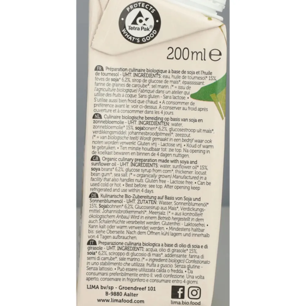Lima Soy Cuisine Bio is een plantaardig alternatief, zonder lecithine, voor kookroom op basis van Soya. Soya Cuisine kan toegevoegd worden aan soepen, sauzen hartige en zoete gerechten om een extra smeuïge toets te geven. Soya Cuisine is zoutarm, rijk aan onverzadigde vetten en gluten- en lactosevrij waardoor Soja Cuisine makkelijk verteerbaar is.
