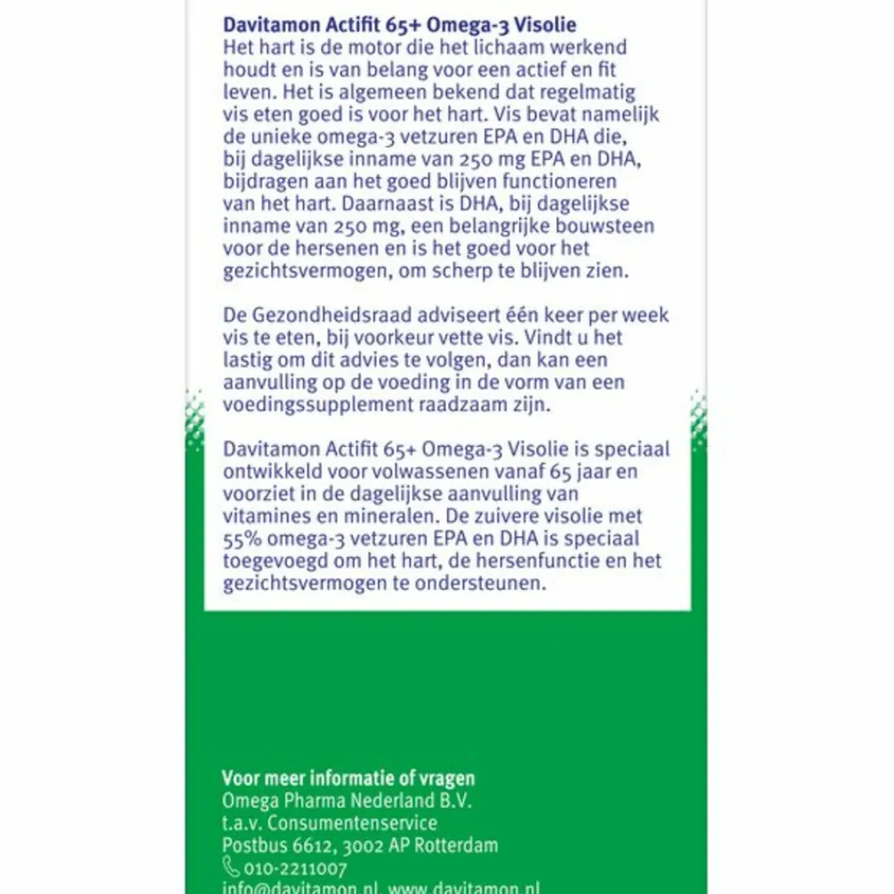 Davitamon Actifit 65+ Omega-3 Visolie is een multivitamine en mineraal waaraan visolie is toegevoegd. Davitamon Actifit 65+ met omega-3 visolie is speciaal ontwikkeld voor volwassenen vanaf 65 jaar en voorziet, als het niet lukt om alle vitaminen en mineralen door je voeding binnen te krijgen, in de dagelijkse aanvulling van vitamines en mineralen die bij het ouder worden van belang zijn.