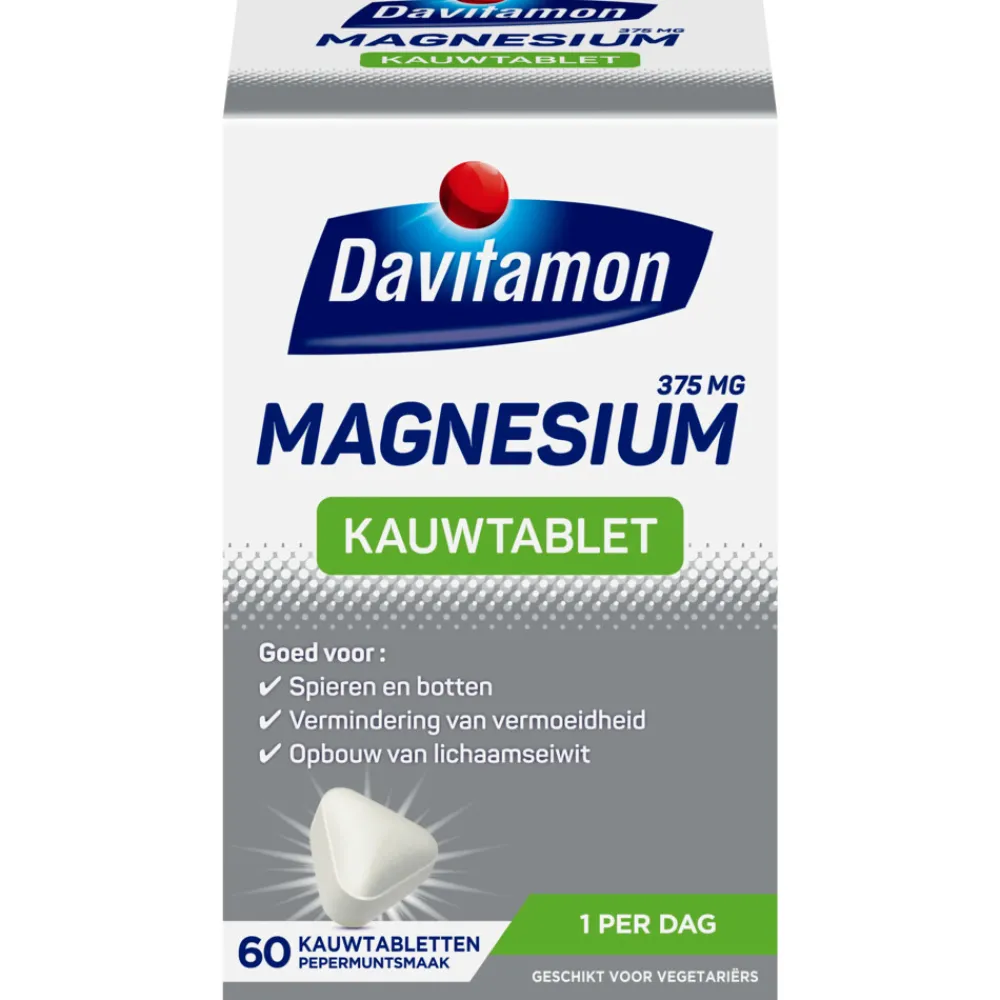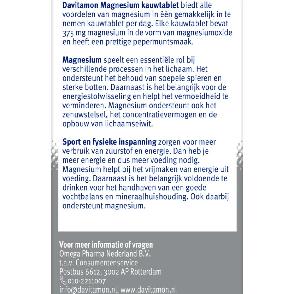 Davitamon Magnesium Kauwtablet bevatten wel 375mg magnesiumoxide per kauwtablet. Magnesium ondersteunt het behoud van soepele spieren en sterke botten, bevordert het de energiestofwisseling en helpt het dus bij futloosheid en vermoeidheid. Daarnaast zorgt magnesium voor het goed functioneren van het zenuwstelsel, concentratievermogen en de opbouw van lichaamseiwit. Magnesium helpt bij het vrijmaken van energie uit voeding.