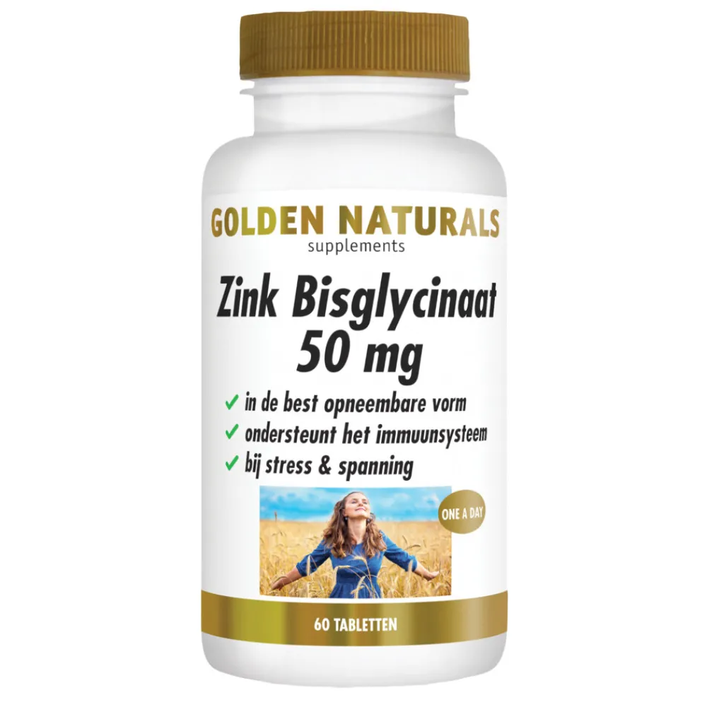 Golden Naturals Zink Bisglycinaat 50 mg is een voedingssupplement met zink in de best opneembare vorm van zink bisglycinaat. Zink speelt een rol in vele lichaamsprocessen, zoals het immuunsysteem, celdelingsproces, hormoonhuishouding en ondersteunt het behoud van gezonde huid, haar, nagels en sterke botten. Maar het speelt ook een rol bij de opbouw en afbraak van koolhydraten, vetten en eiwitten.