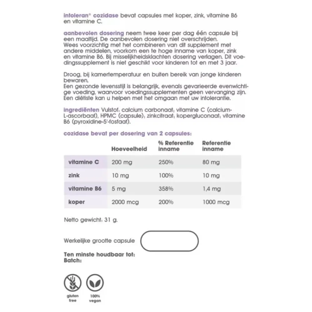 Cozidase is glutenvrij en geschikt voor vegetariërs en veganisten.