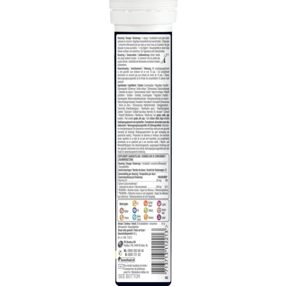 Lucovitaal Calcium 500mg + D3 Citroensmaak bruistabletten zijn ontworpen om sterke botten te behouden en soepele spieren te ondersteunen. Deze tabletten bevatten een krachtige dosis vitamine D3, essentieel voor de opname van calcium en fosfor en voor de gezondheid van het skelet. Calcium, cruciaal voor het behoud van normale botten, complementeert deze formule. Met een frisse citroensmaak en de vegan formule heb je een complete ondersteuning van je botten en spieren.