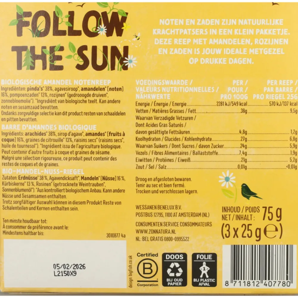 PINDA’S* 38%, honing* 20%, AMANDELEN* [NOTEN] 16%, pompoenzaden* 13%, rozijnen* (gedroogde druiven*, zonnebloemolie*) 13%. *Ingrediënt van biologische teelt. Kan sporen bevatten van andere noten en sesamzaad.