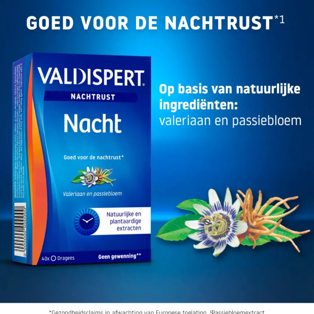 Valdispert Nacht Tabletten (40st) is een voedingssupplement op basis van passiebloem- en valeriaanextract. Passiebloemextract ondersteunt de nachtrust en helpt om lekker te slapen*. Het valeriaanextract is afkomstig van de wortel waarvan een zuiver geconcentreerd extract van wordt gemaakt van hoge kwaliteit. Valeriaan geeft een ontspannen en rustig gevoel*. Daarnaast bevat het geen conserveermiddelen en is vrij van geur- en smaakstoffen.