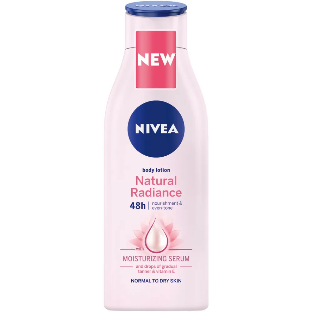 NIVEA Natural Radiance Body Lotion 200ml met Hydraterend Serum, Vitamine E en een paar kleine druppels van geleidelijke zelfbruiner geeft 3 effecten in 1 product. De formule geeft 48u intensieve hydratatie voor de huid en zorgt voor een merkbaar zachtere huid. NIVEA Natural Radiance Body Lotion bouwt geleidelijk een egale, natuurlijke glans op en is geschikt voor de normale tot droge huid. Huidvriendelijkheid dermatologisch goedgekeurd.