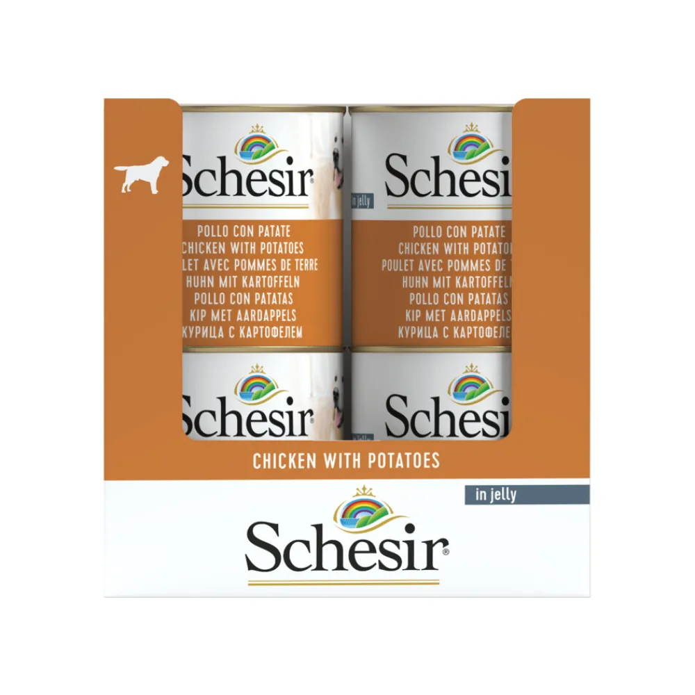 OmschrijvingSchesir Hondenvoer Kip Aardappel in GeleiHet recept is op basis van heerlijke, echte kipfilets gecombineerd …