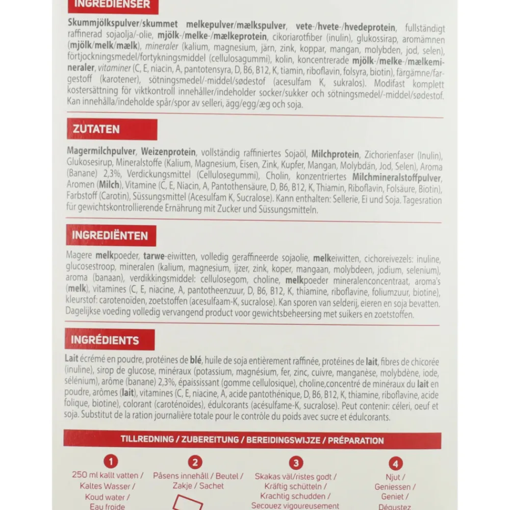 Magere melkpoeder, tarwe-eiwitten, volledig geraffineerde sojaolie, melkeiwitten, cichoreivezels: inuline, glucosestroop, mineralen (kalium, magnesium, ijzer, zink, koper, mangaan, molybdeen, jodium, selenium), aroma (banaan), verdikkingsmiddel: cellulosegom, choline, melkpoeder mineralenconcentraat, aroma’s (melk), vitamines (C, E, niacine, A, pantotheenzuur, D, B6, B12, K, thiamine, riboflavine, foliumzuur, biotine), kleurstof: carotenoïden, zoetstoffen (acesulfaam-K, sucralose).