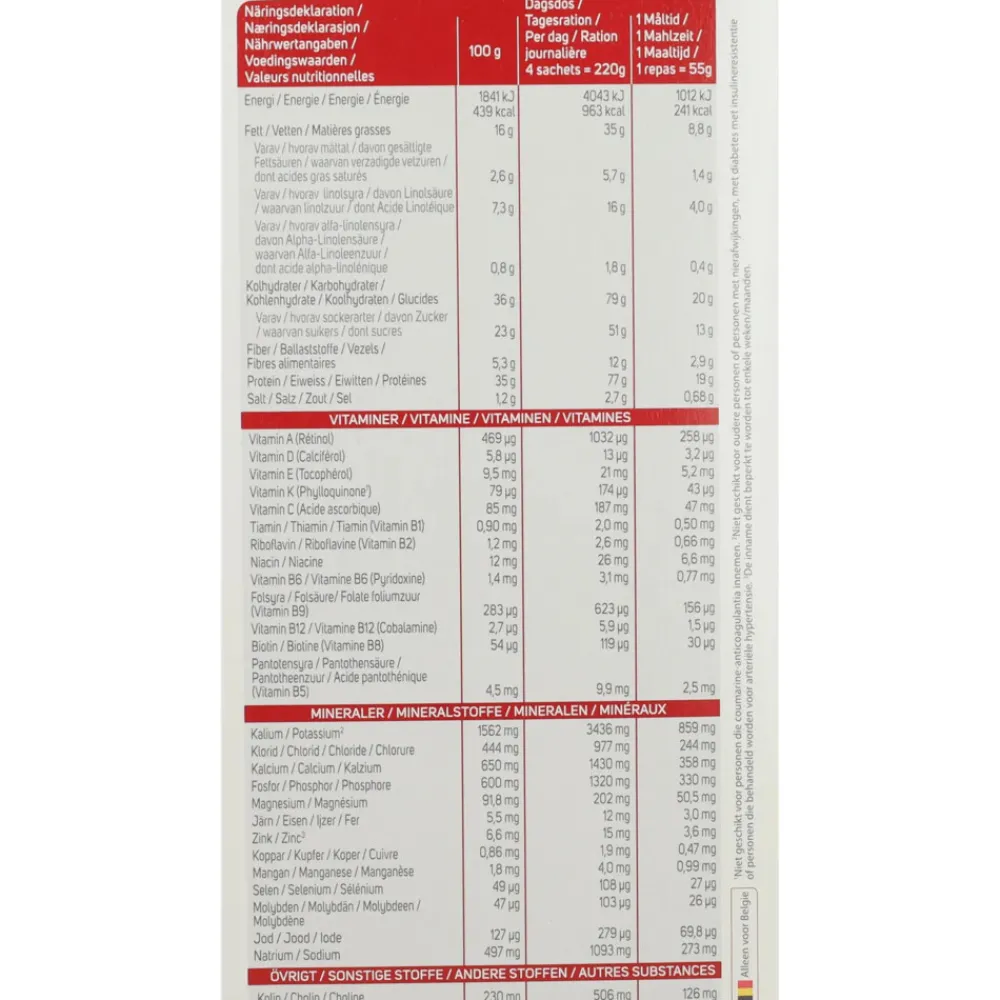 | 100 g | Per dag 4 sachets = 220g | 1 Maaltijd = 55g | |