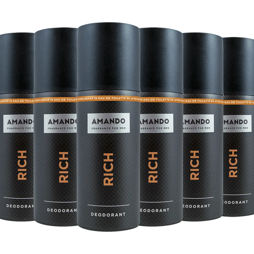 Amando Rich Deospray geeft een krachtige en warme geur waarin friszoete accenten van mandarijn en bergamot, gecombineerd worden met de zoete kruidige geuren van cederhout, amber en kaneel.Omhul jezelf met de mannelijke geur van Amando Rich en ruik je de hele dag warm en zoet.