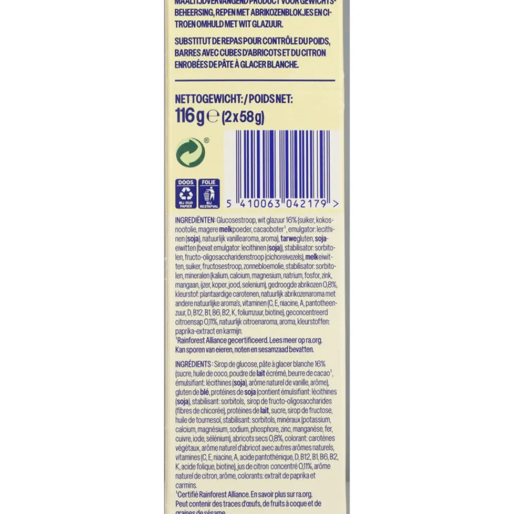 Glucosestroop, wit glazuur 16% (suiker, kokosnootolie, magere melkpoeder, cacaoboter^1, emulgator: lecithinen (soja), natuurlijk vanillearoma, aroma), tarwegluten, sojaeiwitten (bevat emulgator: lecithinen (soja)), stabilisator: sorbitolen, fructo-oligosaccharidenstroop (cichoreivezels), melkeiwitten, suiker, fructosestroop, zonnebloemolie, stabilisator: sorbitolen, mineralen (kalium, calcium, magnesium, natrium, fosfor, zink, mangaan, ijzer, koper, jood, selenium), gedroogde abrikozen 0,8%, kleurstof: plantaardige carotenen, natuurlijk abrikozenaroma met andere natuurlijke aroma’s, vitaminen (C, E, niacine, A, pantotheenzuur, D, B12, B1, B6, B2, K, foliumzuur, biotine), geconcentreerd citroensap 0,11%, natuurlijk citroenaroma, aroma, kleurstoffen: paprika-extract en karmijn.