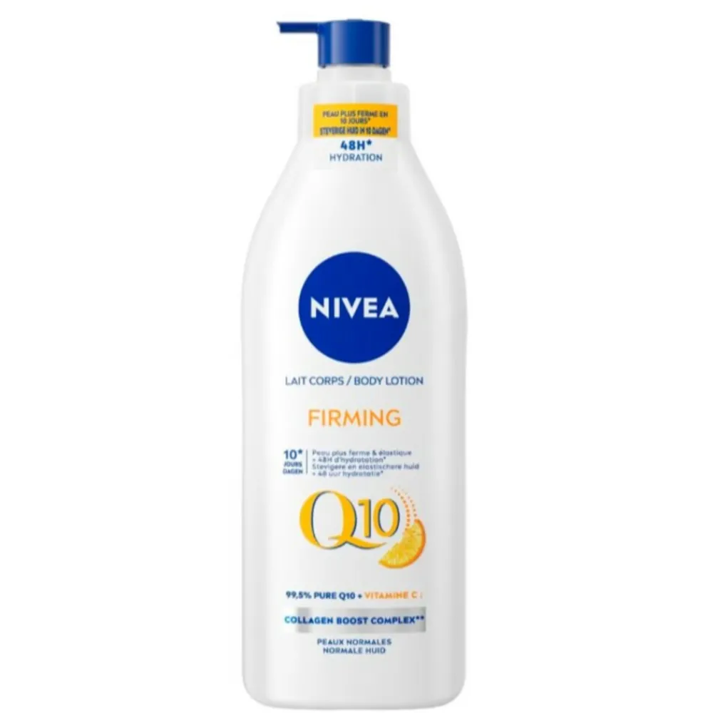 NIVEA Q10 Verstevigende Body Lotion 400ml met Q10 en Vitamine C verstevigt de huid merkbaar en verbetert de elasticiteit vanaf 10 dagen*. De formule hydrateert gedurende 48 uur en geeft een aangename geur. NIVEA Q10 Verstevigende Body Lotion is geschikt voor de droge huid. Huidvriendelijkheid dermatologisch goedgekeurd. *Instrumentele evaluatie, 33 vrouwen, 2 weken