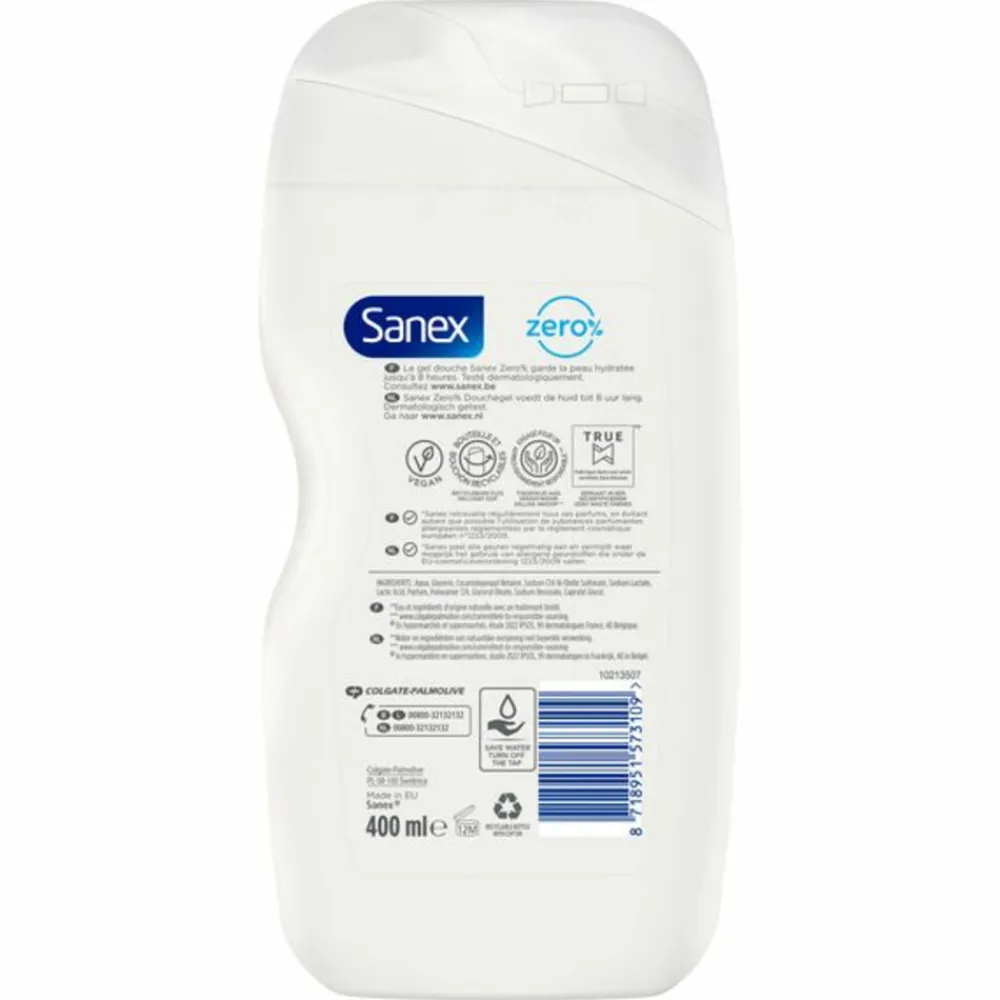De voedende douchegel voor de droge huid van Sanex Zero% is samengesteld met essentiële ingrediënten en houdt de huid tot 8 uur lang gehydrateerd. De body wash bevat geen microplastics, sulfaten of kleurstoffen.