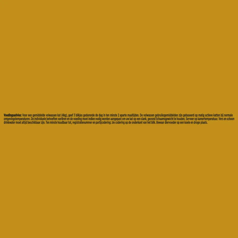 Voor een gemiddelde volwassen kat (4kg), geef 2 tot 3 blikjes per dag in ten minste 2-3 aparte maaltijden. De volwassen gebruiksgemiddelden zijn gebaseerd op matig actieve katten bij normale omgevingstemperaturen. Individuele behoeften variëren en voedingshoeveelheden dienen, indien nodig, aangepast te worden om jouw kat op een slank en gezond gewicht te houden. Serveren op kamertemperatuur.