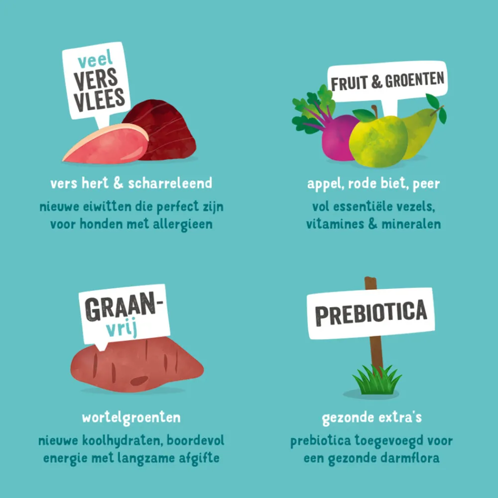 verse eend 35%, bataten, erwten, erwteneiwit, vers hert 5%, visolie, eendensaus, lijnzaad, mineralen, mannan-oligosachariden (MOS), fructo-oligosachariden (FOS), appels 0,04%, rode bieten 0,04%, peer 0,04%, bosbessen 0,04%, vossenbessen 0,04%, goudsbloemblaadjes, brandnetel, braambesblaadjes, venkel, karwij, kamille, melisse.