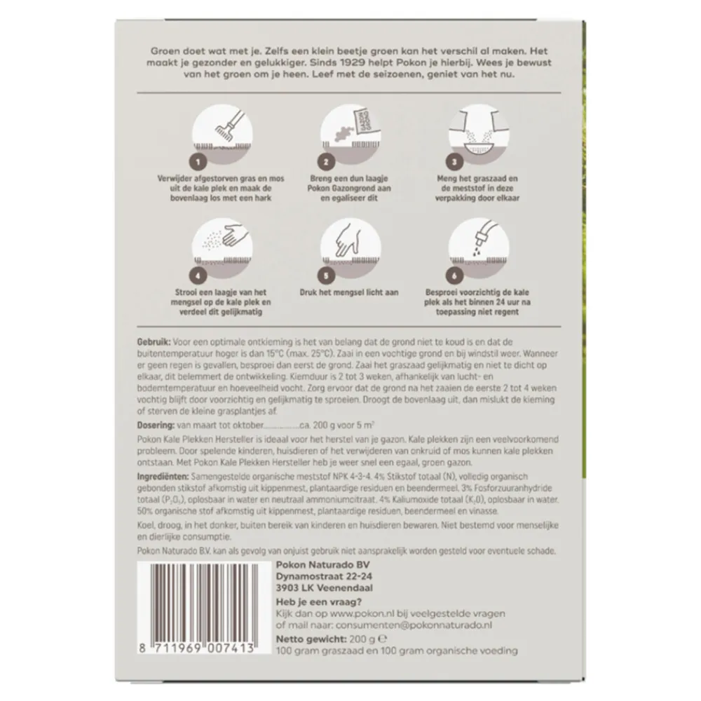 Pokon Kale Plekken Hersteller is ideaal voor het herstel van je gazon. Kale plekken zijn een veelvoorkomend probleem. Door spelende kinderen, huisdieren of het verwijderen van onkruid of mos kunnen kale plekken ontstaan. Met Pokon Kale Plekken Hersteller heb je weer snel een egaal, groen gazon. Voor een optimale ontkieming is het van belang dat de grond niet te koud is en dat de buitentemperatuur hoger is dag 15 graden Celsius (max. 25 graden Celsius). Zaai in een vochtige grond en bij windstil weer. Wanneer er geen regen is gevallen, besproei dan eerst de grond. Zaai het graszaad gelijkmatig en niet te dicht op elkaar, dit belemmert de ontwikkeling. Kiemduur is 2 tot 3 weken, afhankelijk van lucht- en bodemtemperatuur en hoeveelheid vocht.