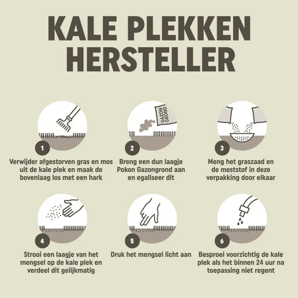 Verwijder afgestorven gras en mos uit de kale plek en maak de bovenlaag los met een hark. Breng een dun laagje Pokon Gazongrond aan en egaliseer dit. Meng het graszaad en de meststof in deze verpakking door elkaar. Strooi een laagje van het mengsel op de kale plek en verdeel dit gelijkmatig. Druk het mengsel licht aan. Besproei voorzichtig de kale plek als het binnen 24 uur na toepassing niet regent.