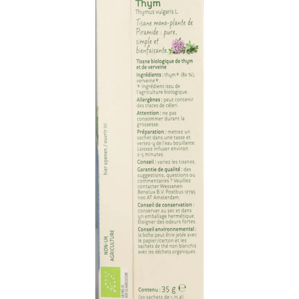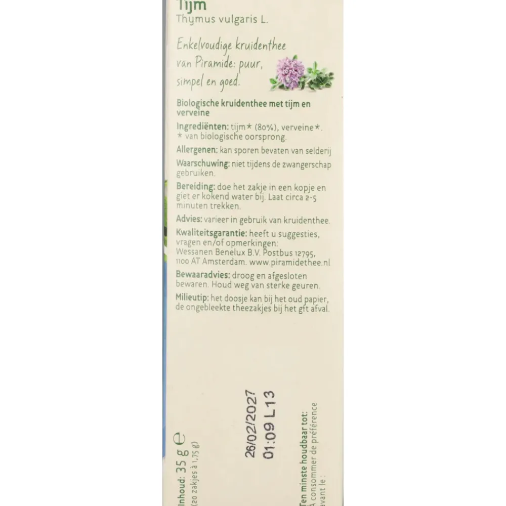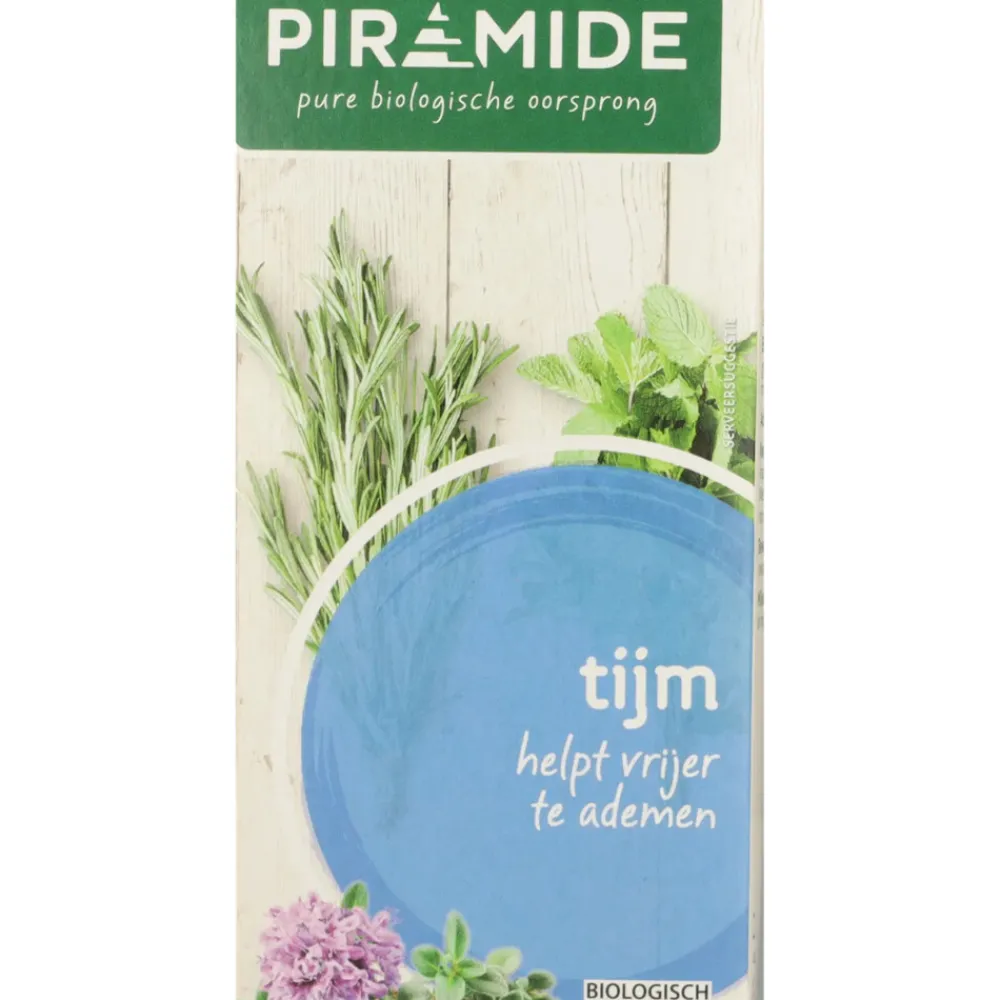 De biologische kruidenthee met Tijm en een vleugje Lemon Myrtle van Piramide is van biologische oorsprong en heeft een verzachtende werking op de luchtwegen. Piramide Kruidenthee is van nature vrij van Theïne.