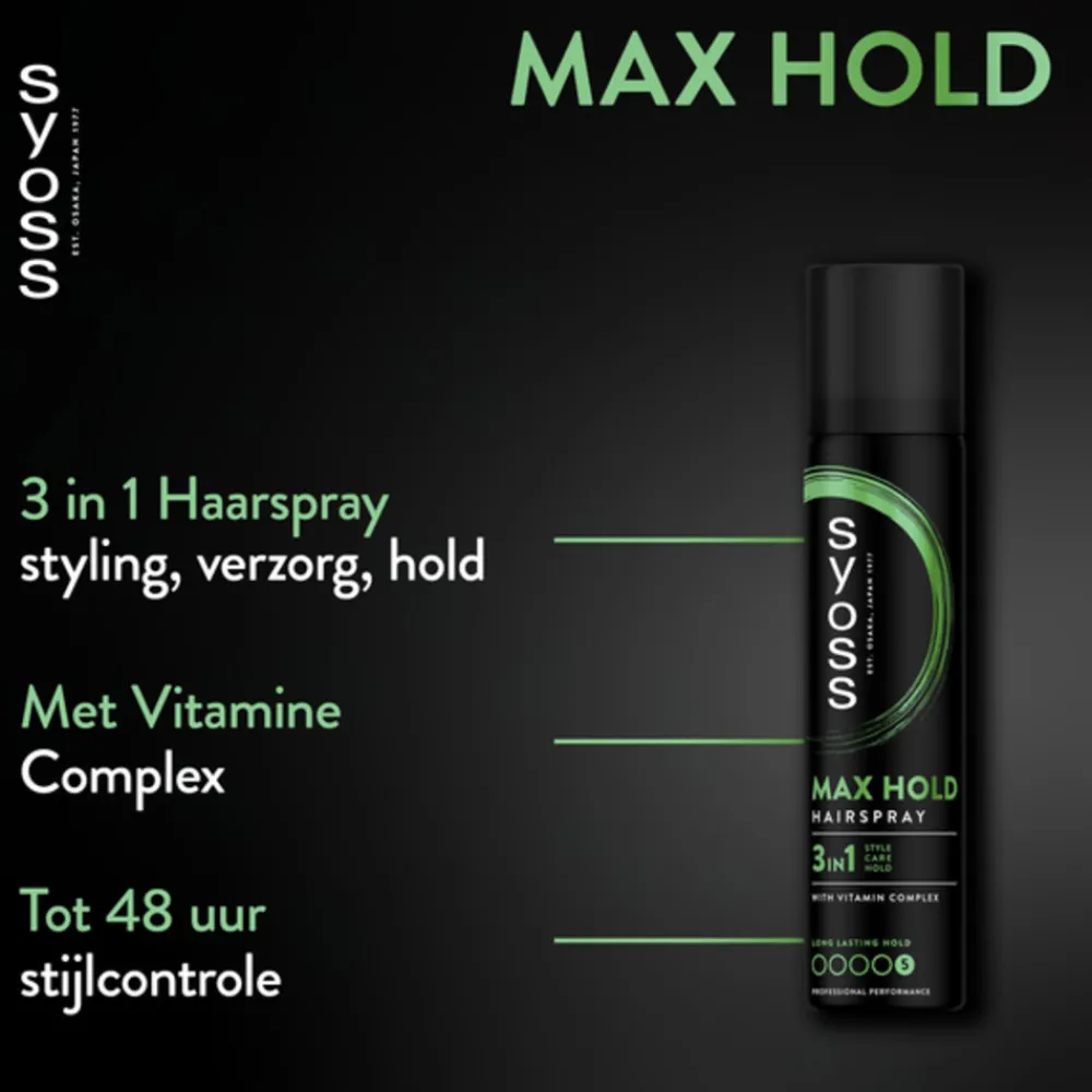 Breng het gevoel dat je net van de kapper komt thuis tot leven met Syoss! De salon- geïnspireerde Syoss Max Hold Haarspray, ontwikkeld met en getest door kappers, geeft tot 48 uur langdurige hold en een intense, sterke fixatie en controle – voor langdurige en resistente salon looks thuis. De 3 in 1 formule: styling, verzorging, herstel – bevat een Vitaminecomplex, een combinatie van Panthenol en Niacinamide, voor een versterkte haarstructuur.