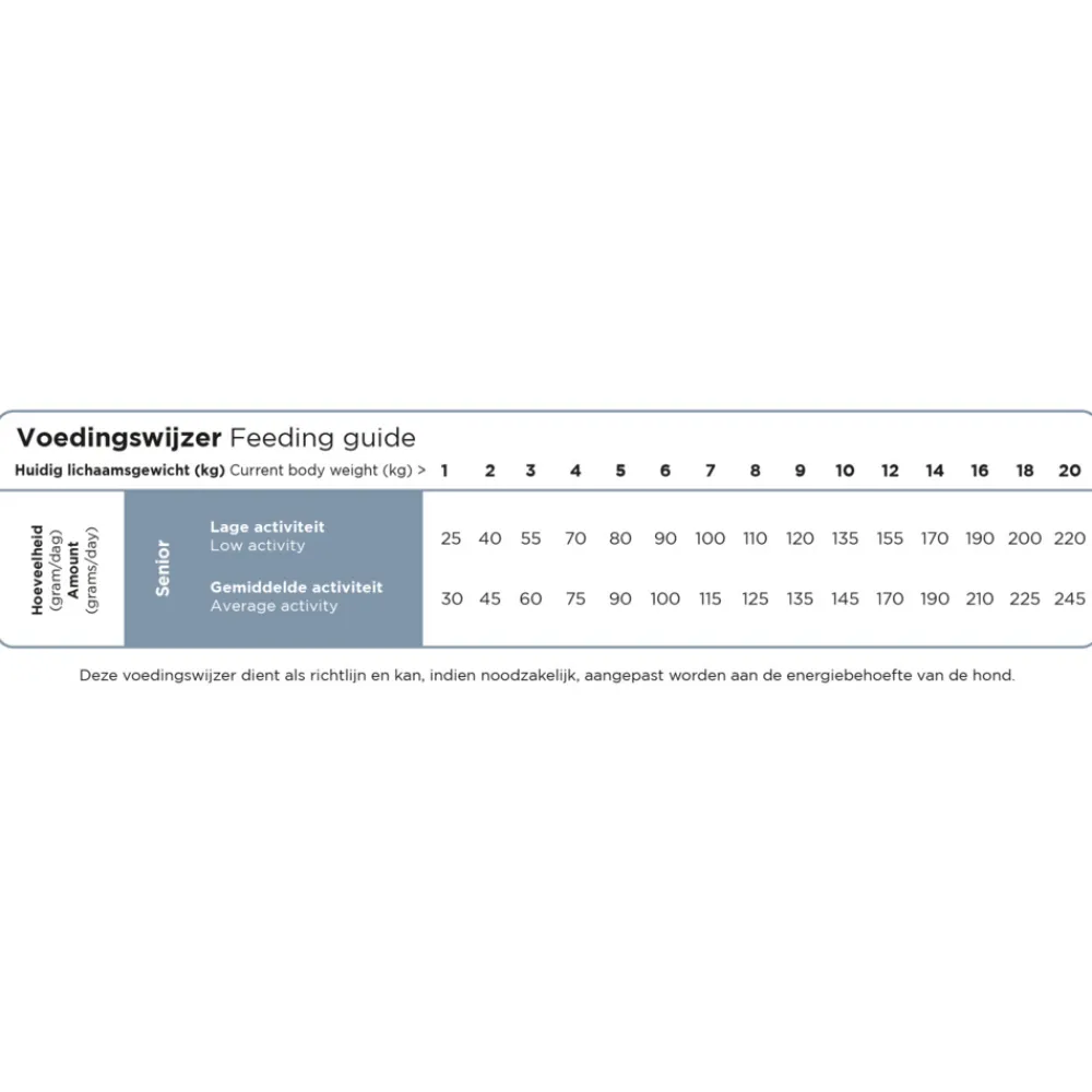 Verdeel de dagelijkse portie voedsel over minimaal twee maaltijden per dag. Zorg dat er altijd voldoende vers water voor je hond klaar staat. Meng gedurende minimaal 7 dagen steeds meer nieuwe voeding door de oude voeding tot je geheel bent overgestapt. Bewaar advies: koel en droog bewaren. Sluit de zak na gebruik goed af. Ten minste houdbaar tot/productiecode: zie achterkant verpakking.
