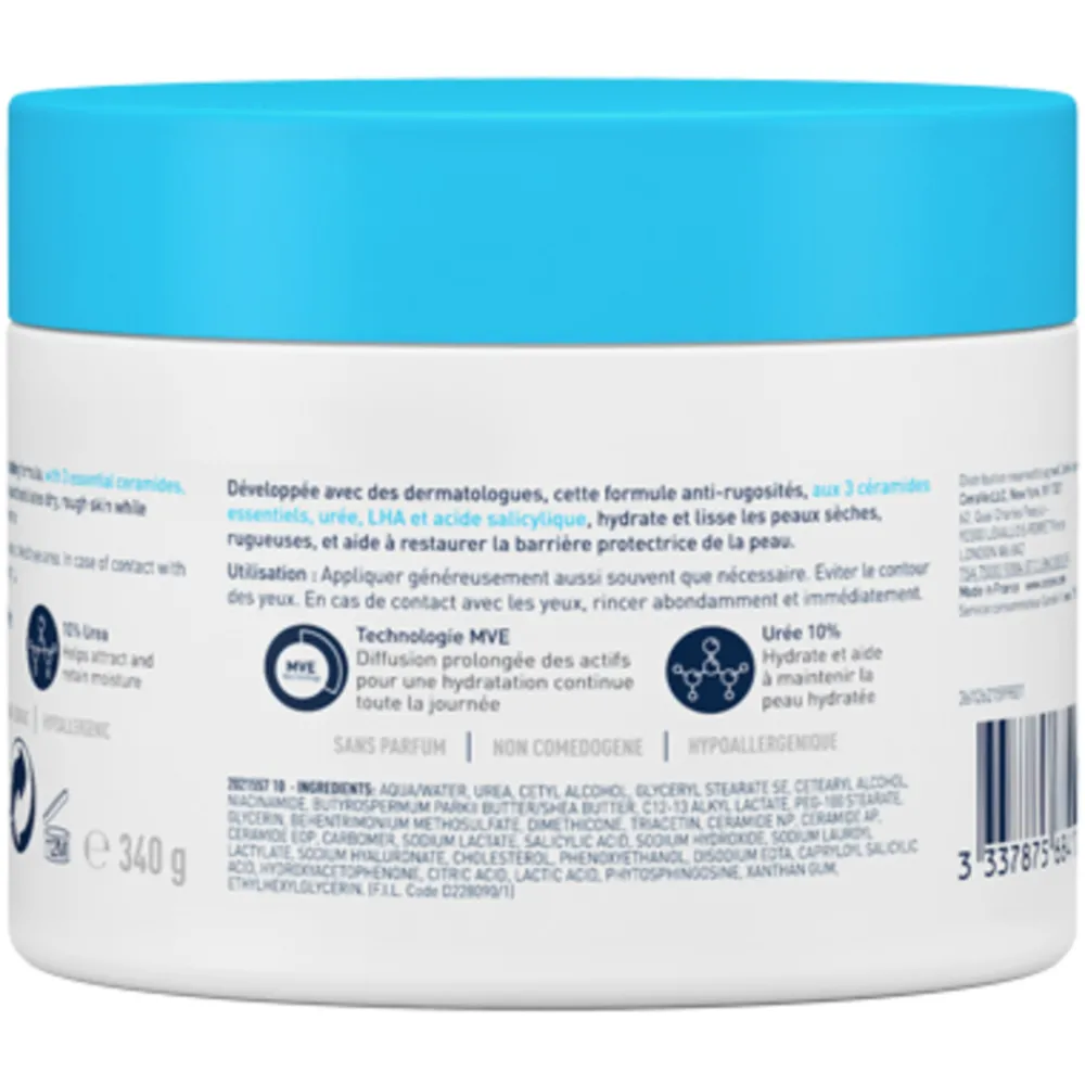 Deze voedende, niet-vette crème is ontwikkeld om de huidtextuur te verbeteren dankzij de gladmakende salicylzuur en ureum. Deze crème verzorgt en hydrateert de huid dankzij de aanwezigheid van hyaluronzuur. De 3 essentiële ceramiden en de MVE technologie helpen de beschermende huidbarrière te herstellen en te beschermen met zichtbare resultaten gedurende de hele dag. Zonder parfum, hypoallergeen.