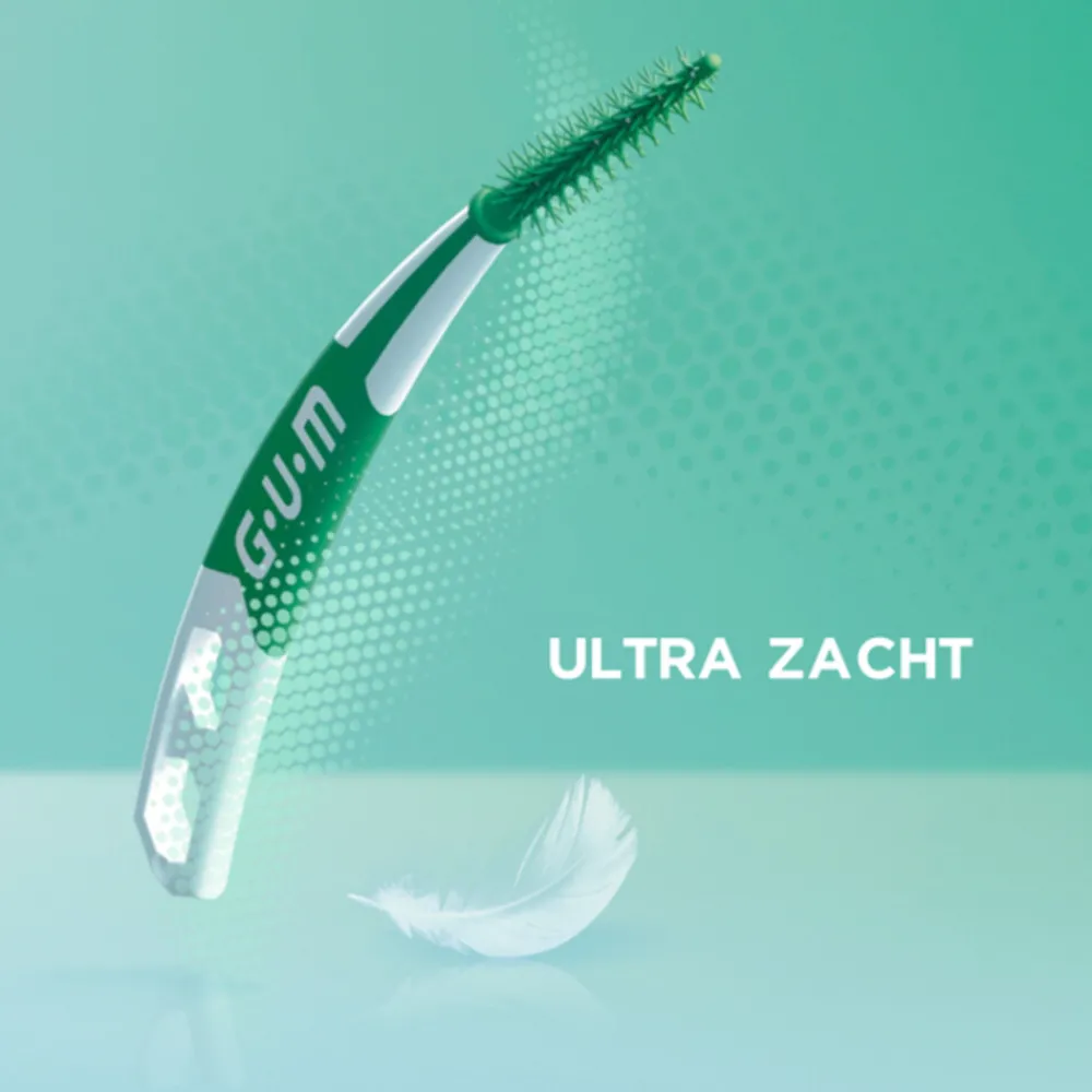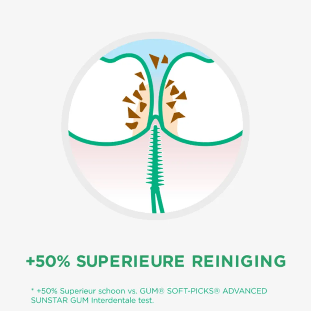 Met onze populaire rubberen interdentale microborstels kun je zacht en effectief reinigen daar waar je tandenborstel alleen er niet bij kan. GUM® SOFT-PICKS® PRO helpt bij het verwijderen van voedselresten en tandplak die tussen je tanden zijn verborgen dankzij zachte, flexibele rubberen borstelharen die comfortabel tussen de tanden glijden voor een zachte, maar diepe reiniging. Deze microborstel biedt ook superieur tandvlees- en tandcomfort – het is ontworpen zonder latex, hout of metaal – en masseert zelfs je tandvlees.