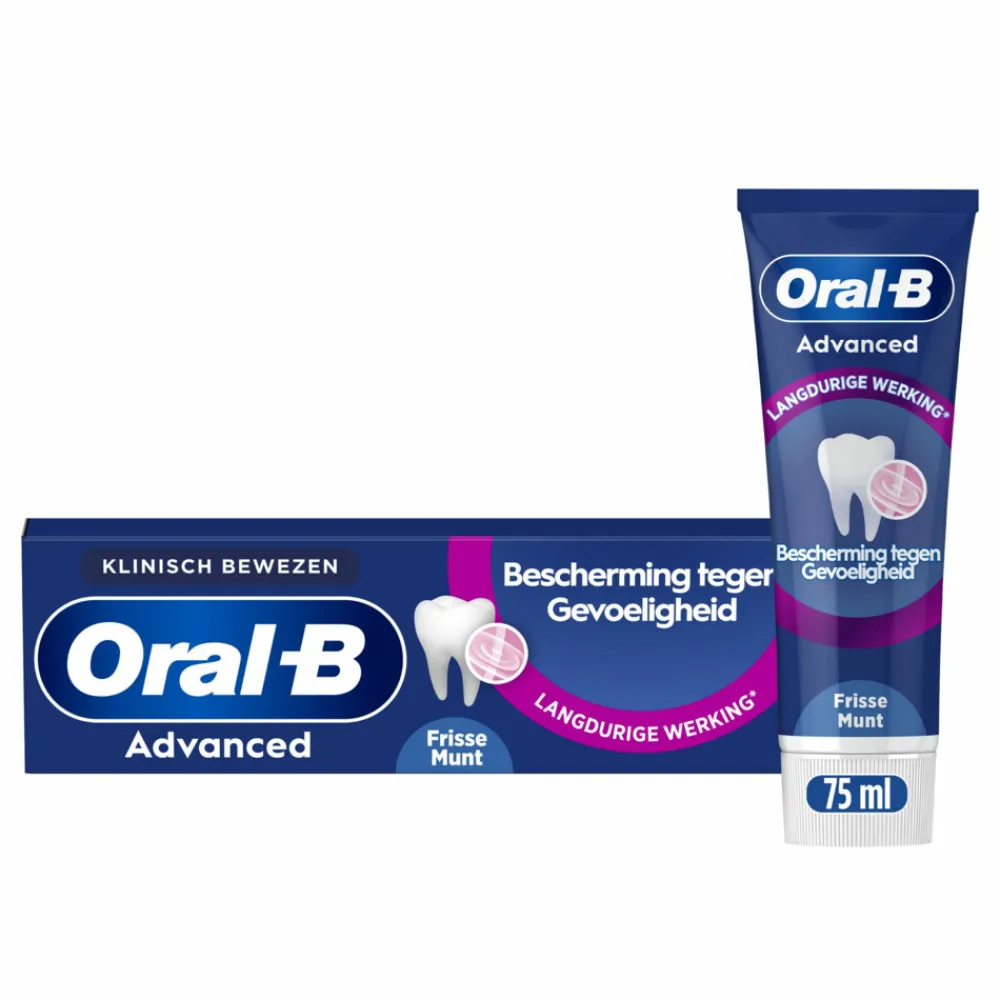 Oral-B Advanced Bescherming Gevoelige Tanden Frisse Munt is klinisch bewezen: het biedt langdurige bescherming voor gevoelige tanden, bij voortdurend gebruik. De unieke antibacteriële technologie van Oral-B met tinfluoride-complex en actieve kalmerende bestanddelen creëert een beschermend schild om gevoelige tanden effectief te beschermen, zelfs tussen de poetsbeurten door, terwijl het een verkoelend gevoel geeft tijdens en na het poetsen. Geschikt voor gevoelige tanden. Dagelijkse tandpasta
