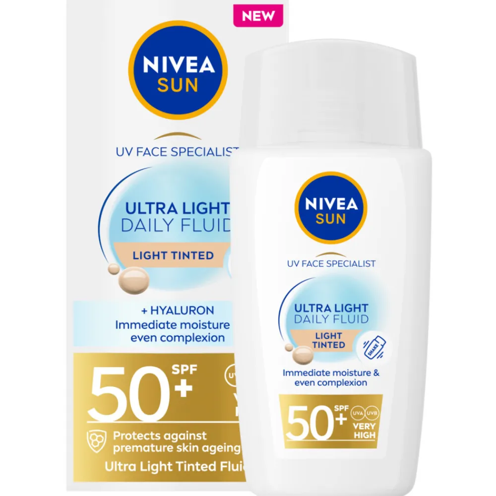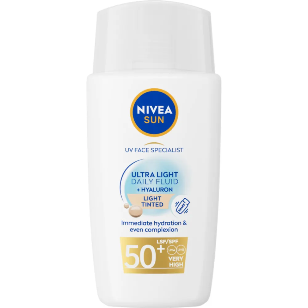 Bescherm je gezicht en geef je teint een natuurlijke uitstraling met NIVEA SUN UV Face Specialist Ultra Light Daily Fluid Medium Tinted SPF50+. Deze lichte zonnebrandcrème beschermt tegen UVA/UVB-stralen en blauw licht, waardoor vroegtijdige huidveroudering effectief wordt tegengegaan. Ideaal voor dagelijks gebruik en geschikt voor alle huidtypen. De Daily Fluid met getinte pigmenten hydrateert je huid en zorgt voor een egale, natuurlijke teint met een langdurige dekking. De formule is niet-vettig, niet-plakkerig en wordt onmiddellijk opgenomen zonder residu achter te laten, waardoor je huid fris en comfortabel aanvoelt. Of je nu op zoek bent naar een zonnebrandcreme gezicht, een zonnecreme spf 50, of een betrouwbare bescherming voor elke dag, dit product biedt de ideale combinatie van verzorging en bescherming.