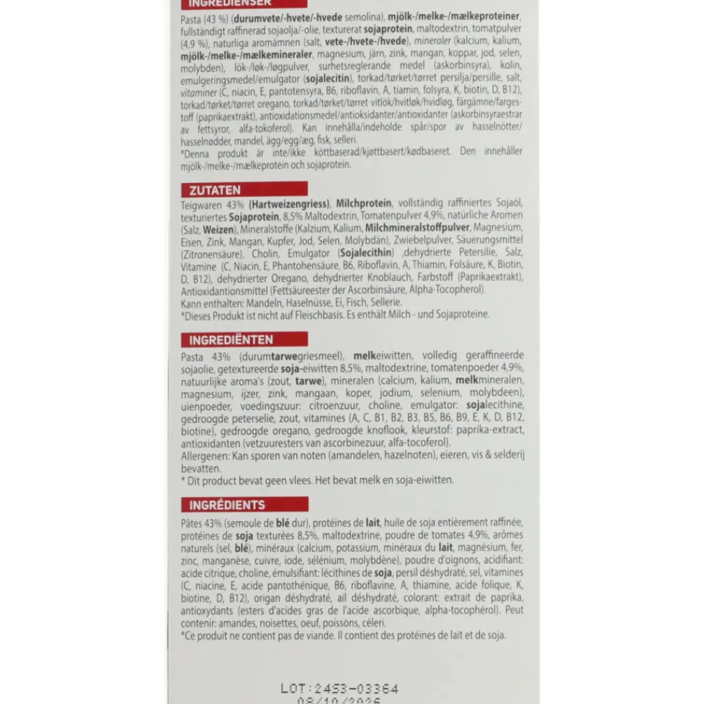 Pasta 43% (durumtarwegriesmeel), melkeiwitten, volledig geraffineerde sojaolie, getextureerde soja-eiwitten 8,5%, maltodextrine, tomatenpoeder 4,9%, natuurlijke aroma’s (zout, tarwe), mineralen (calcium, kalium, melkmineralen, magnesium, ijzer, zink, mangaan, koper, jodium, selenium, molybdeen), uienpoeder, voedingszuur: citroenzuur, choline, emulgator: sojalecithine, gedroogde peterselie, zout, vitamines (A, C, B1, B2, B3, B5, B6, B9, E, K, D, B12, biotine), gedroogde oregano, gedroogde knoflook, kleurstof: paprika-extract, antioxidanten (vetzuuresters van ascorbinezuur, alfa-tocoferol).