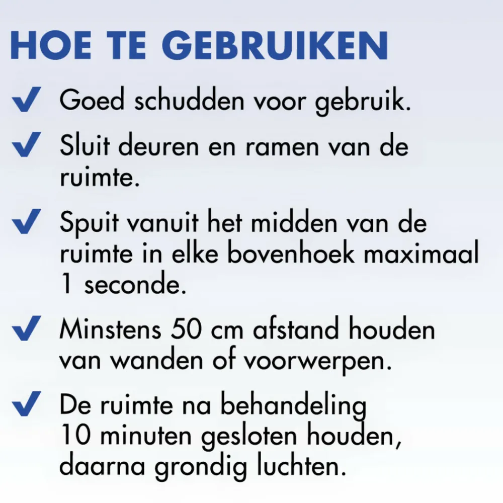 Sluit eerst deuren en ramen van de te behandelen ruimte. Spuit vanuit het midden van de ruimte in elke bovenhoek niet langer dan 1 seconde. De werkzame stof wordt fijn door de ruimte verdeeld en blijft in de lucht zweven. Insecten vliegen er doorheen en ademen de stof in. Samenstelling: Pyrethrinen en piperonylbutoxide (PBO).