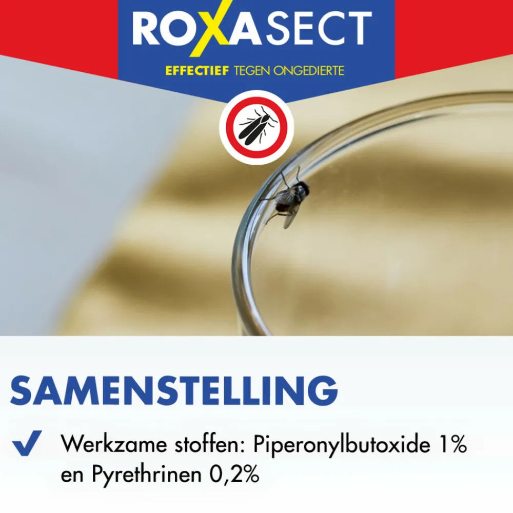 Roxasect Spuitbus Vliegende Insecten bestrijdt vliegende insecten, zoals vliegen – muggen – motten, snel, langdurig en effectief. De werkzame stof prikkelt het zenuwstelsel. Daarna volgt een verlamming waardoor het insect doodgaat.