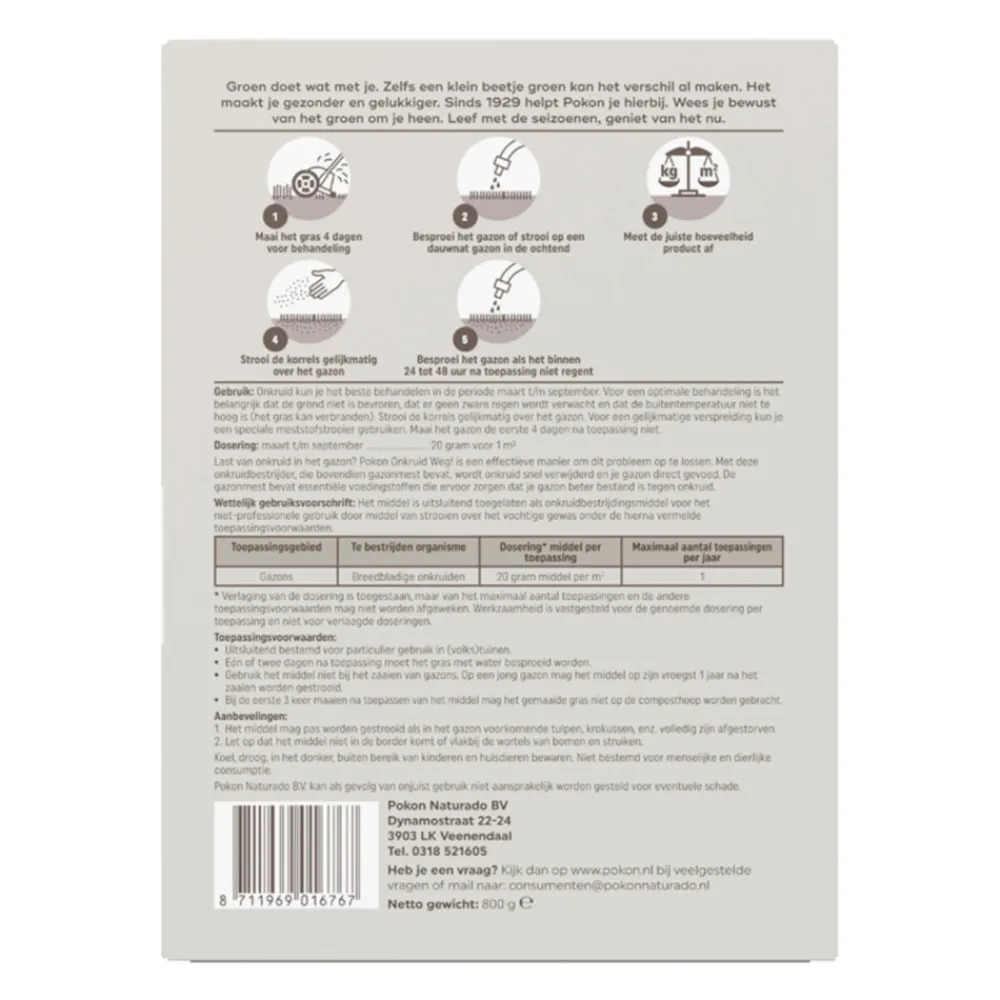Last van onkruid in je gazon? Pokon Onkruid Weg! is een effectieve manier om dit probleem op te lossen. Met deze onkruidbestrijder, die bovendien gazonmest bevat, wordt onkruid snel verwijderd en je gazon direct gevoed. De werkzame stoffen in dit product veroorzaken een oncontroleerbare groei van onkruiden. De bladeren gaan opkrullen en uiteindelijk verwelkt en sterft het onkruid af tot in de wortel. Het gras van de behandelde plekken kan door de aanwezige meststof ook sneller gaan groeien, waardoor er mogelijk kleurverschil kan ontstaan. Het kleurverschil verdwijnt in de loop van tijd. De essentiële voedingsstoffen in deze gazonmest zorgen ervoor dat je gazon beter bestand is tegen onkruid. Onkruid kun je het beste behandelen in de periode maart t/m september. Voor een optimale behandeling is het belangrijk dat de grond niet is bevroren, dat er geen zware regen wordt verwacht en dat de buitentemperatuur niet te hoog is (het gras kan verbranden). Maai het gazon de eerste 4 dagen na toepassing niet.