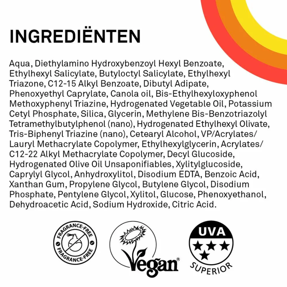 Aqua, Diethylamino Hydroxybenzoyl Hexyl Benzoate, Ethylhexyl Salicylate, Butyloctyl Salicylate, Ethylhexyl Triazone, C12-15 Alkyl Benzoate, Dibutyl Adipate, Phenoxyethyl Caprylate, Canola oil, Bis-Ethylhexyloxyphenol Methoxyphenyl Triazine, Hydrogenated vegetable oil, Potassium Cetyl Phosphate, Silica, Glycerin, Methylene Bis-Benzotriazolyl Tetramethylbutylphenol (nano), Hydrogenated ethylhexyl olivate, Tris-Biphenyl Triazine (nano), Cetearyl Alcohol, VP/Acrylates/ Lauryl Methacrylate Copolymer, Ethylhexylglycerin, Acrylates/C12-22 Alkyl Methacrylate Copolymer, Decyl Glucoside, Hydrogenated olive oil unsaponifiables, Xylitylglucoside, Caprylyl Glycol, Anhydroxylitol, Disodium EDTA, Benzoic acid, Xanthan Gum, Propylene Glycol, Butylene Glycol, Disodium Phosphate, Pentylene Glycol, Xylitol, Glucose, Phenoxyethanol, Dehydroacetic acid, Sodium Hydroxide, Citric acid.
