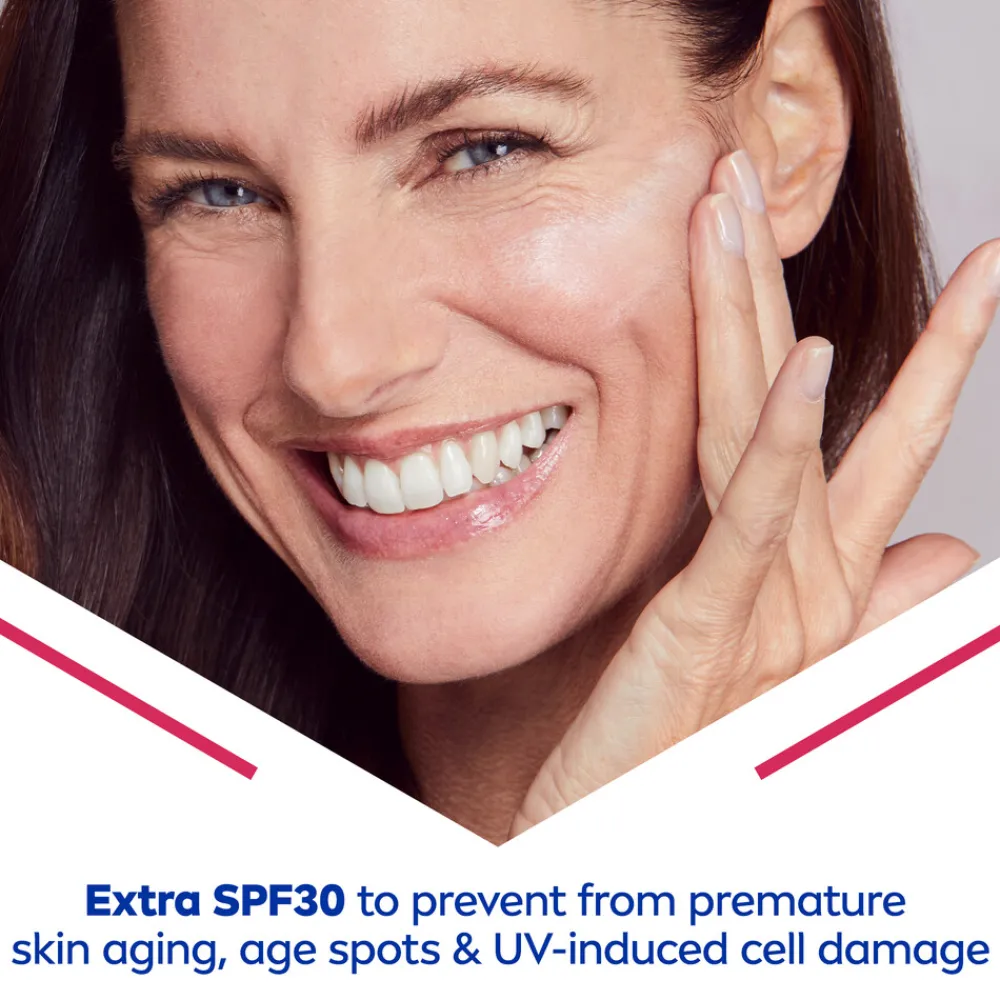 NIVEA Cellular Expert Lift Anti-Age Dagcrème SPF30 50ml bevat een combinatie van krachtige anti-age ingrediënten die diep in de cel werken. Een jonger uitziende huid is een zichtbare weerspiegeling van cellulaire activiteiten. De dagcrème bevat pure Bakuchiol en Micro & Macro Hyaluronzuur. Bakuchiol is een ingrediënt van plantaardige oorsprong, afkomstig van de Babchiplant (Psoralea corylifolia). Het ondersteunt de collageenproductie van de cel, vermindert diepe rimpels, verstevigt de huid en laat de huid glad aanvoelen. De twee anti-age ingrediënten staan er om bekend dat ze huid hydrateren, glad maken en helpen om rimpels zichtbaar te verminderen. Macro Hyaluronzuur helpt het huidoppervlak intens te hydrateren en glad te maken, door tot 1000 keer het gewicht in water vast te houden. Micro Hyaluronzuur dringt nog dieper door in de huid, waardoor een rimpels worden verminderd. De dagcrème bevat SPF30 UVA/UVB zonnefilters, voor een optimale bescherming.