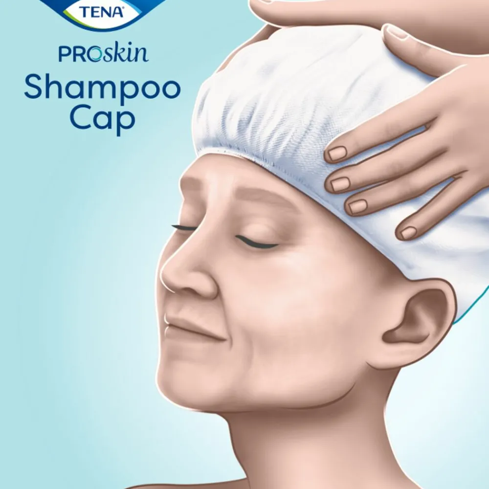 TENA ProSkin Shampoo Cap is een douchecap die geïmpregneerd is met fris geparfumeerde shampoo en conditioner voor comfortabel en gemakkelijk haar wassen wanneer douchen of in bad gaan een uitdaging vormen. De douchecap is eenvoudig te gebruiken. Plaats hem over droog haar en masseer de shampoo en conditioner voor drie minuten in het haar. Geeft het haar een fris en schoon gevoel – naspoelen is niet nodig. De cap kan ook worden opgewarmd in de magnetron in zijn ongeopende verpakking voor extra comfort. Niet bedoeld om het haar droog te houden.