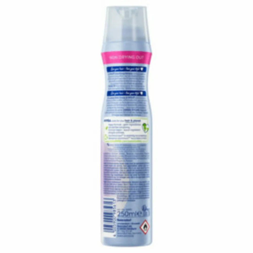 Nivea Extra Strong Styling Spray 2 geeft tot 24 uur extra sterke fixatie. De innovatieve formule met Panthenol en Vitamine B3 versterkt en beschermt het haar en is makkelijk uitkambaar. Draagt zorg voor het haar en droogt het niet uit – voor mooi gestyled haar. Voor mooi en zichtbaar gezond haar dat de hele dag goed zit.