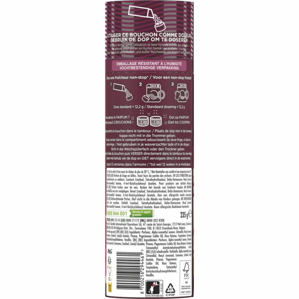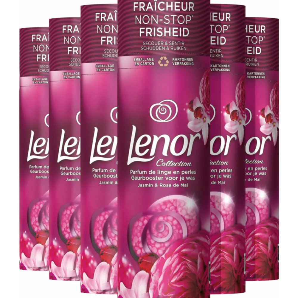 Voor een extra portie frisheid na elke was (tot 12 weken in de kledingkast), verzadigt Lenor je kleding met de geur van jasmijn & rose de mai. Haal de godin in je naar boven. Onthul je goddelijke vrouwelijkheid met een weelderige geur die is geïnspireerd op de geurtonen van rode vruchten, luxueuze bloemaccenten en een complexe mix van verrukkelijke akkoorden van bijvoorbeeld vanille, chocolade en noten. Lenor Jasmijn & Rose de Mai Geurboosters Voor Je Was zijn gecreëerd om perfect te harmoniëren met Lenor Jasmijn & Rose de Mai wasverzachter. Lenor geurboosters voor je was hebben een vochtbestendige kartonnen verpakking.
