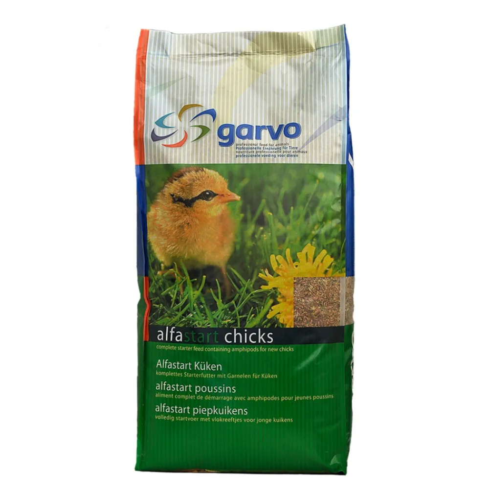 Alfastart van Garvo is speciaal voor piepkuikens vanaf 2 dagen oud tot circa 3 weken oud. Het is een volledige voeding van meel met korrels en vlokreeftjes. Alfastart is ook geschikt voor rassen met een moeilijke beginontwikkeling.