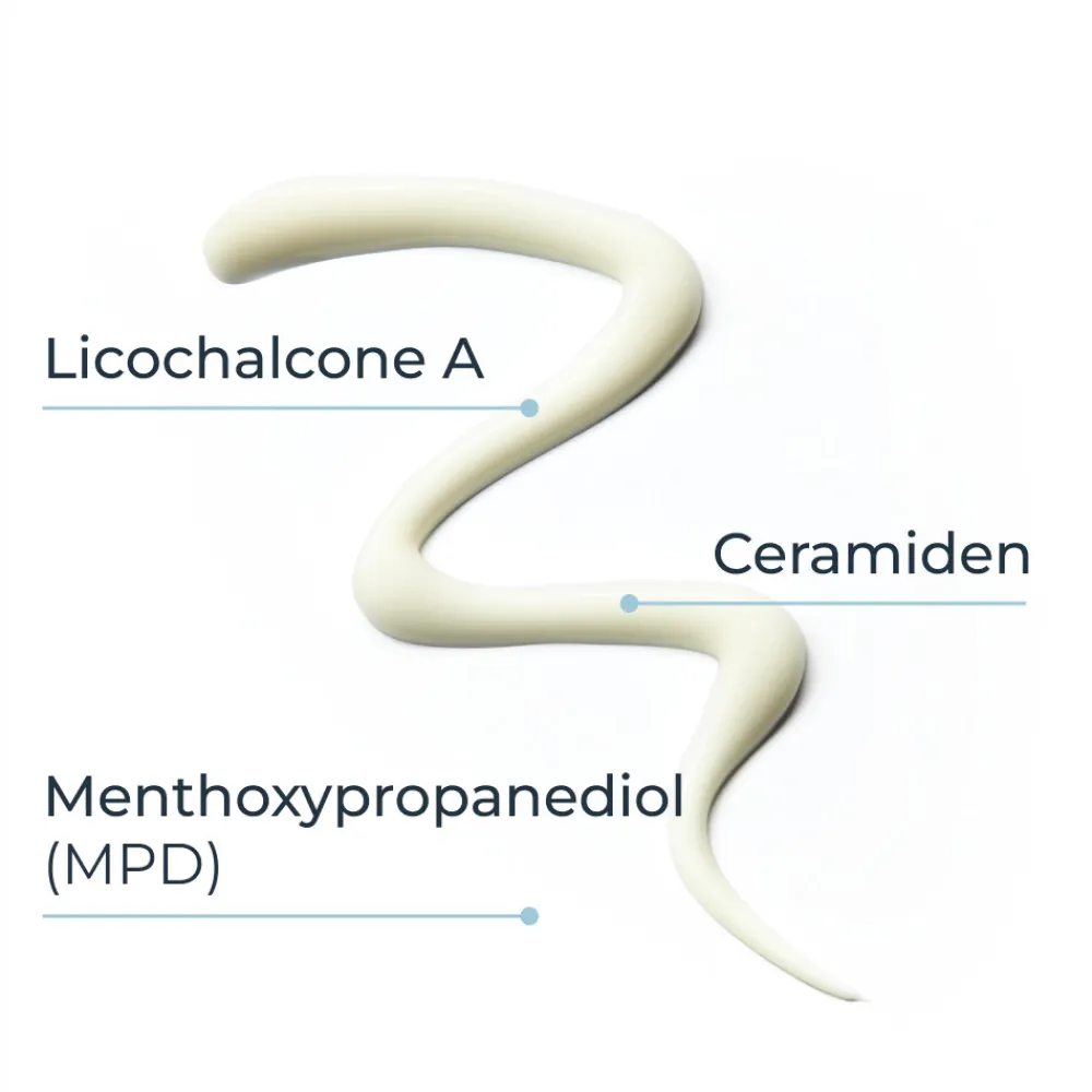 Aqua, glycerin, caprylic/capric triglyceride, dimethicone, pentaerythrityl tetraisostearate, triisostearin, vitis vinifera seed oil, oenothera biennis oil, cetyl alcohol, glyceryl stearate, peg-40 stearate, glycyrrhiza inflata root extract, ceramide 3, decylene glycol, menthoxypropanediol, sodium citrate, citric acid, tocopherol, ascorbyl palmitate, trisodium edta, bht, 1,2-hexanediol, phenoxyethanol, piroctone olamine