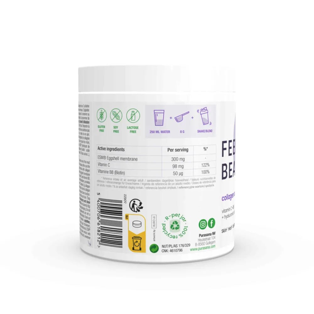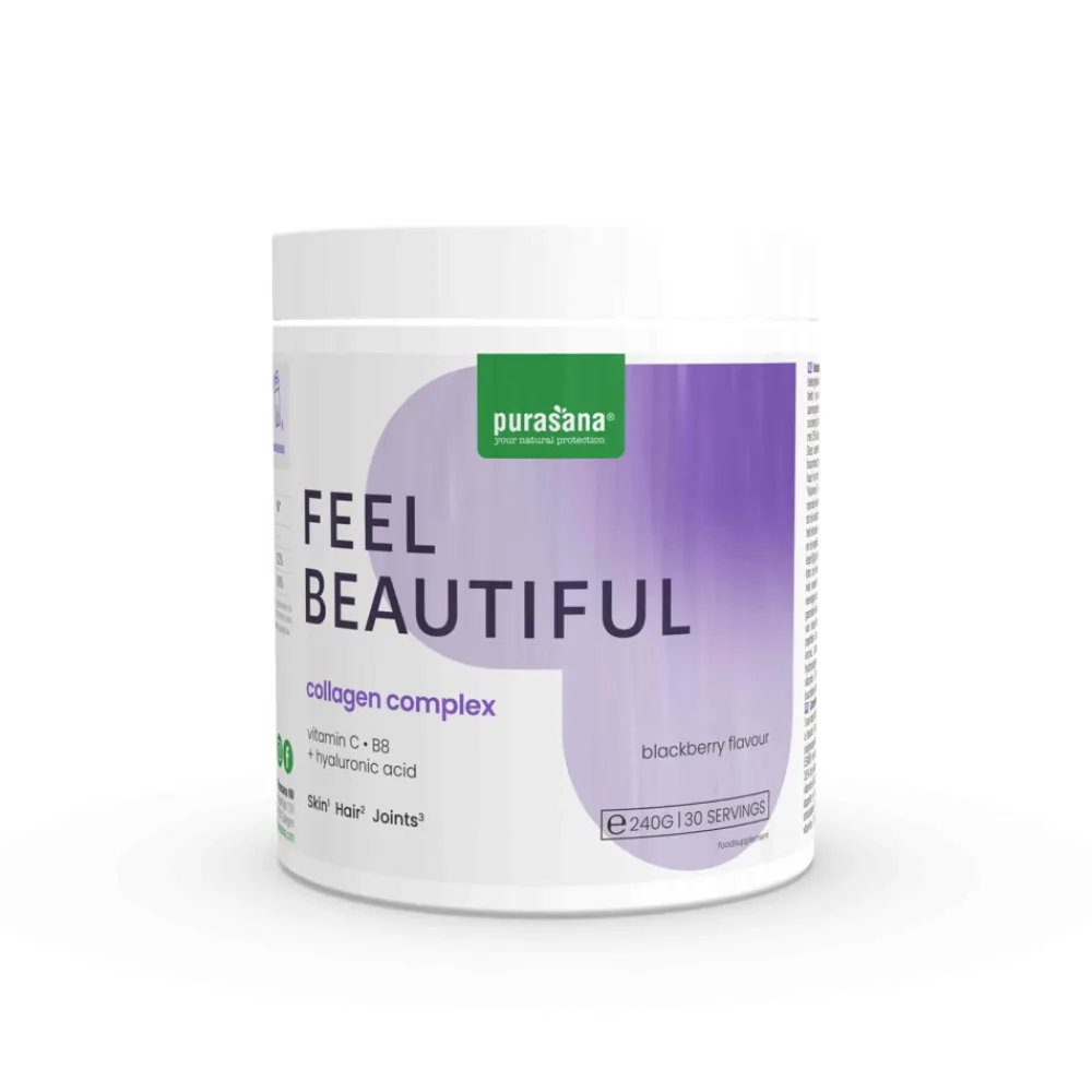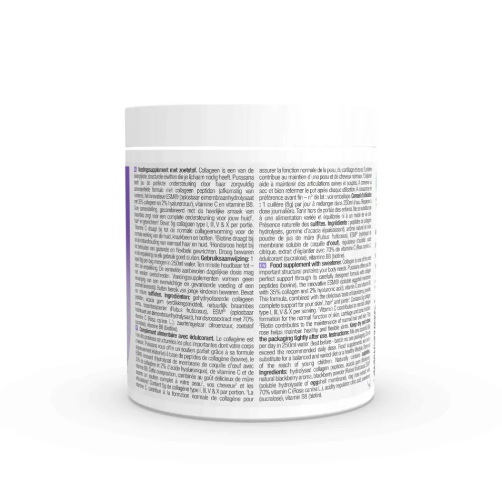 Purasana Collageen Zwarte Bes Huid, Haar en Nagels is een voedingssupplement bestaande uit een zorgvuldig samengestelde formule met collageen peptiden afkomstig van runderen, ESM (oplosbaar eiermembraanhydrolysaat met 35% collageen en 2% hyalonzuur), vitamine C en vitamine B8. Deze bijzondere samenstelling biedt ondersteuning voor huid, haar en gewrichten*. Collageen is een van de meest essentiële, structuele eiwitten die het lichaam nodig heeft. Dit voedingssupplement in poedervorm is gemakkelijk door water te mengen en heeft de heerlijke smaak van braambes.