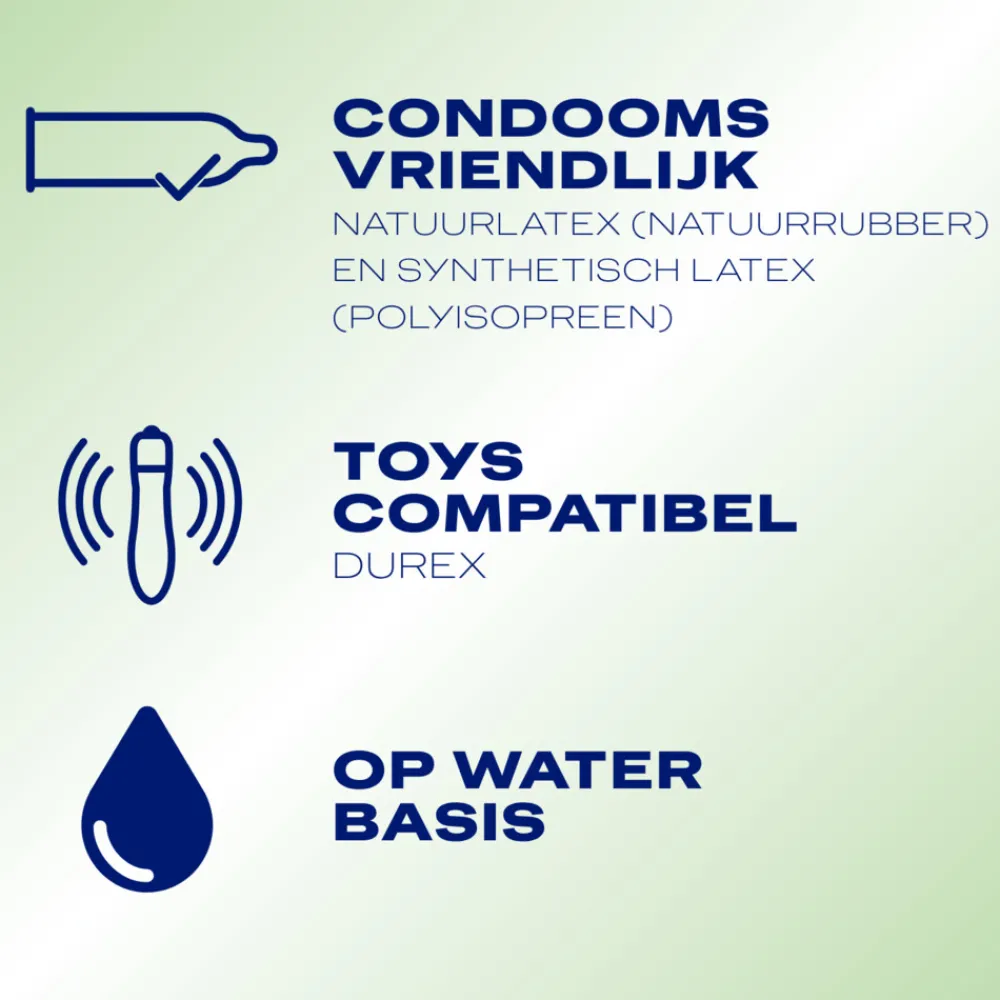 - Dit glijmiddel is geschikt voor condooms en seksspeeltjes van Durex
