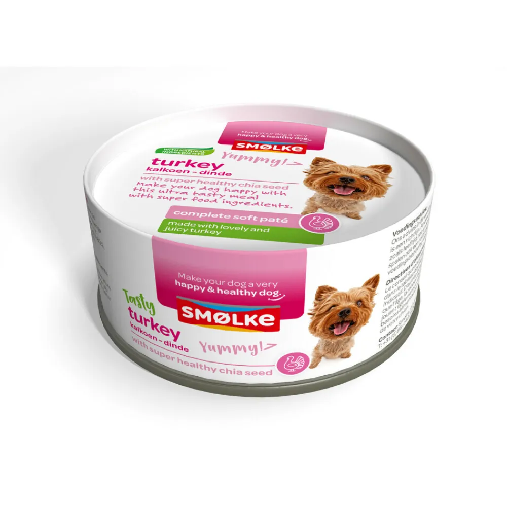 Smølke Soft Paté Kalkoen is een verrukkelijke maaltijd met superfood ingrediënten en een heerlijk zachte bite. De perfecte verwennerij voor jouw hond! De combinatie van hoogwaardige kalkoen en superfoods zoals chiazaad en zalmolie maken deze soft patés een must have op het menu van iedere hond. Een heerlijke complete maaltijd voor de kleine hond en voor de grotere hond een smaakvol tussendoortje!