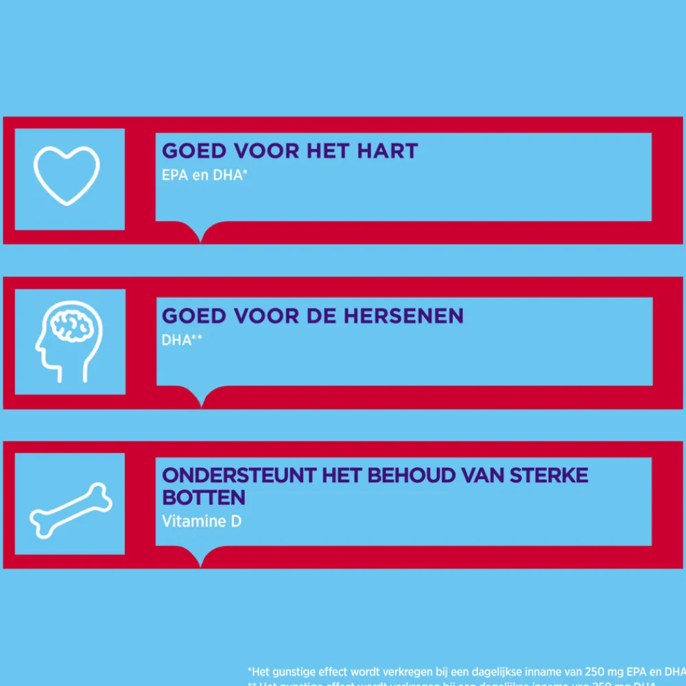 Vitamine D3 20 mcg (=400% RI) Omega-3 visolie 520 mg – waarvan EPA > 150 mg – waarvan DHA > 99 mg – % RI= Het percentage van de Referentie-inname