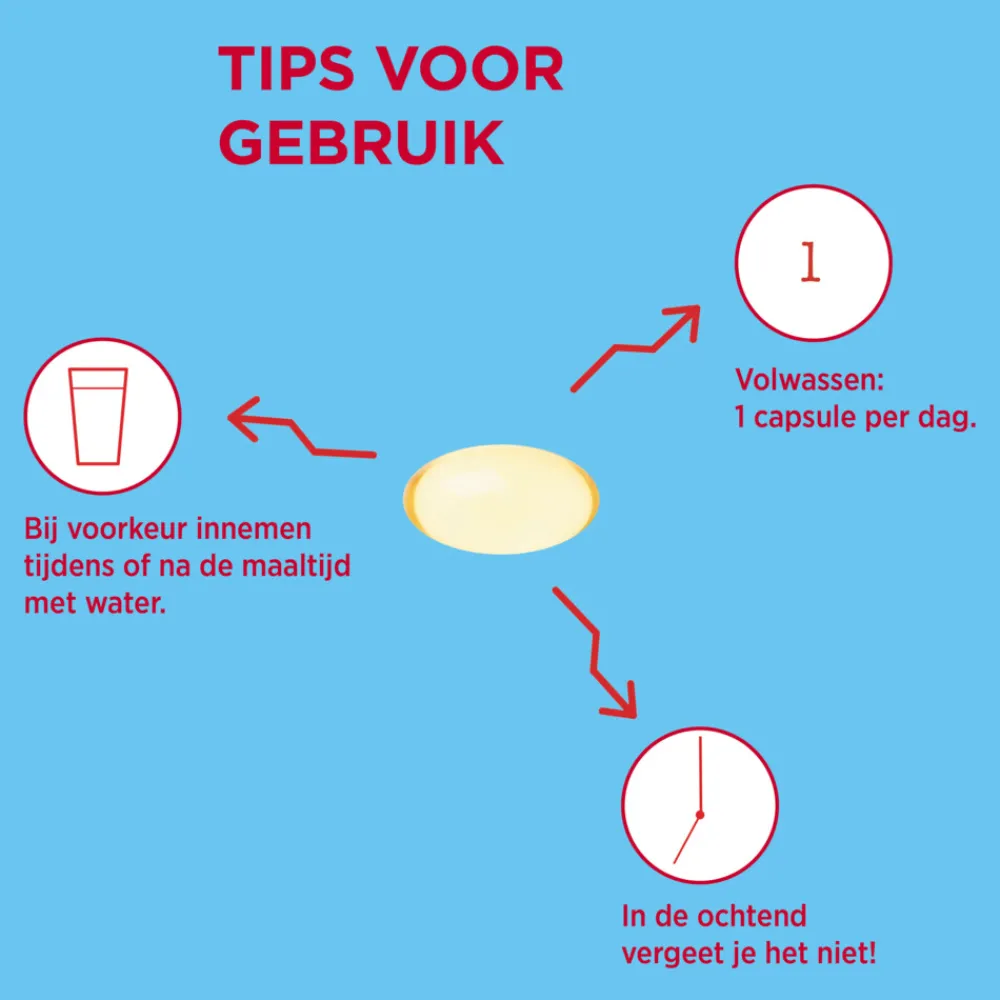 Volwassenen: 1 capsule per dag. Bij voorkeur innemen tijdens of na de maaltijd met water. De aanbevolen dagelijkse dosering niet overschrijden. Dit product is geschikt voor 18 jaar en ouder. De De Gezondheidsraad adviseert ouderen om dagelijks de volgende hoeveelheid extra vitamine D in te nemen: