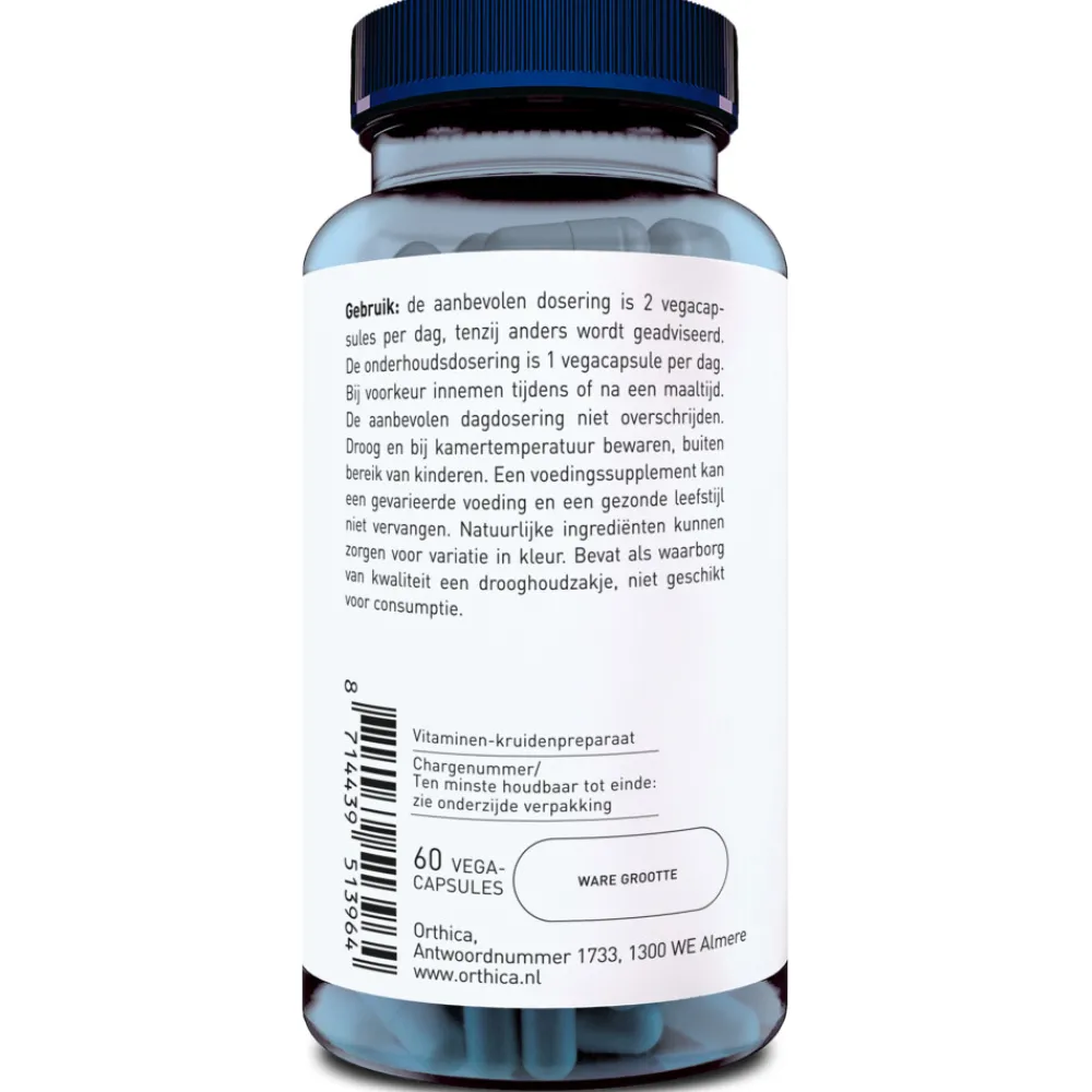 Dit product van Orthica zit in een rPET verpakking. Dit houdt in dat ze gemaakt zijn van gerecycled plastic, namelijk van drink- en waterflessen. Daarnaast zijn ze ook weer opnieuw recyclebaar. Deze verpakkingen hebben dezelfde eigenschappen als de oude PET verpakkingen, waarbij dezelfde kwaliteit en houdbaarheid gegarandeerd blijft. De rPET potten zijn voorzien van een UV-filter, waardoor het supplement beschermd wordt tegen verkleuring door licht.