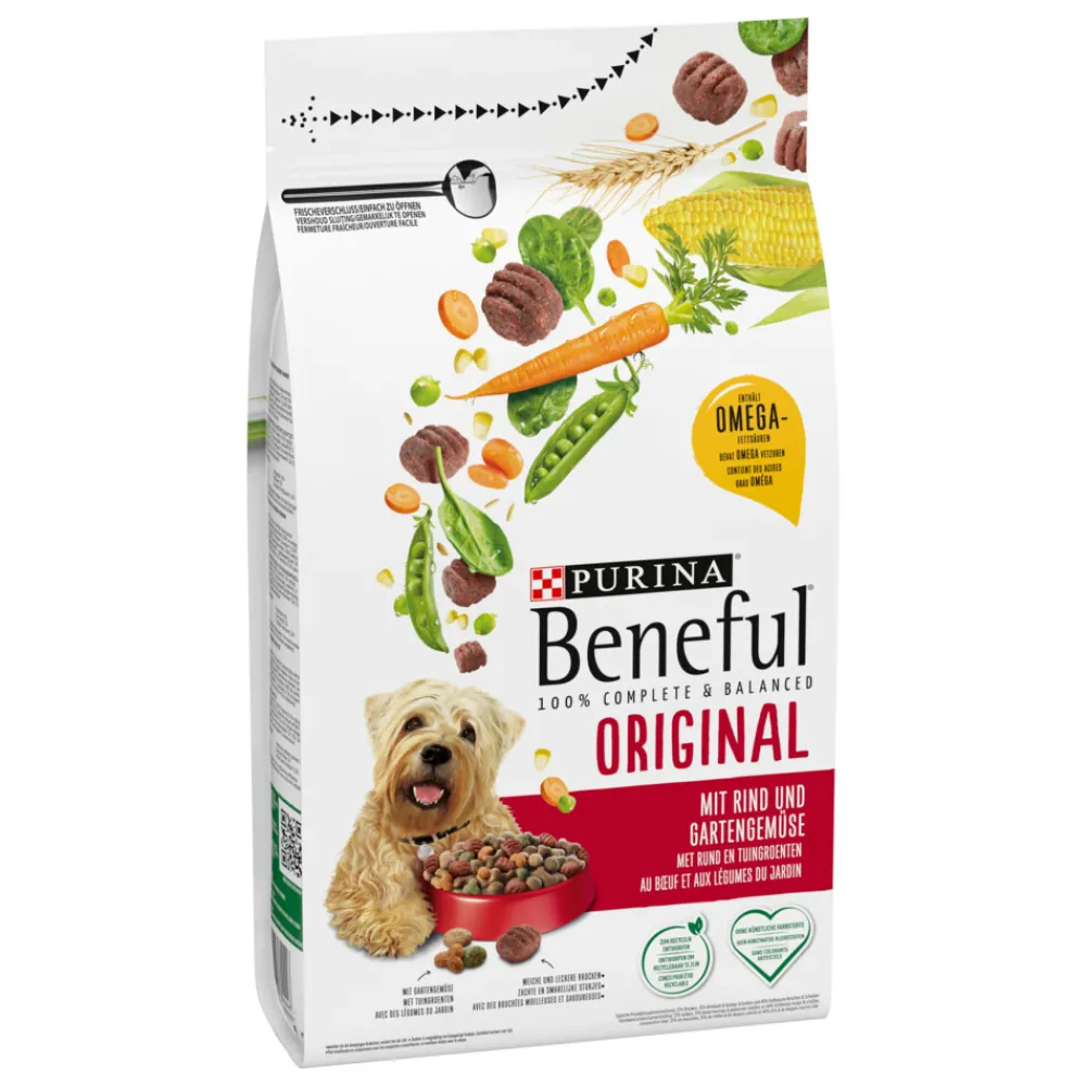 De Original voor unieke honden: Purina Beneful Orginal met zachte* stukjes en knapperige brokjes gemaakt met heerlijke rund, tuingroenten en vitaminen. Zonder toegevoegde kunstmatige kleurstoffen. Vezels uit volkoren granen helpen een goede spijsvertering ondersteunen. Purina Beneful Orginal bevat belangrijke Omega 3 & 6 vetzuren voor een glanzende vacht en behoud van een gezonde huid. De aangepaste hoeveelheid eiwit en vet in de voeding helpen gezonde gewrichten en goede mobiliteit te ondersteunen. Purina Beneful Orginal- Voeding voor een nutritionele balans en een heerlijke smaak. Purina Beneful – Een gezonde portie geluk.