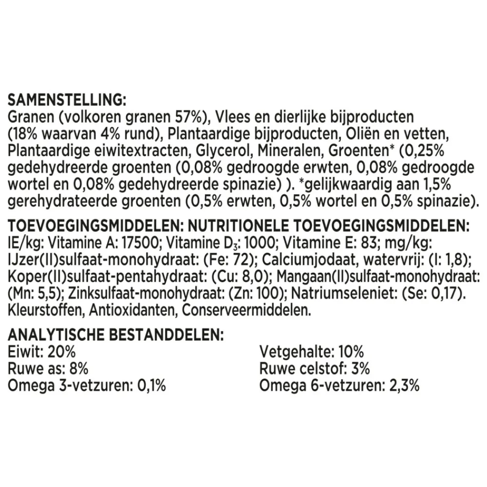 Granen (volkoren 57%) Vlees en dierlijke bijproducten (15%*), Plantaardige bijproducten, Oliën en vetten, Plantaardige eiwitextracten, Glycerol, Mineralen, Propyleenglycol, Groenten (gekleurde klavervormige en schijfvormige brokjes: 0,5%** gedehydreerde groenten (0,25% erwten en 0,25% wortelen)).