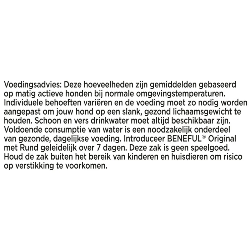 Wijzigingen in het voedingspatroon van jouw hond dienen geleidelijk te worden doorgevoerd om mogelijke spijsverteringsproblemen te vermijden. Vervang huidige voeding met Beneful Original door geleidelijk de hoeveelheid oude voeding te verminderen, over een periode van 10 dagen. Zorg ervoor dat er altijd schoon en vers drinkwater beschikbaar is.